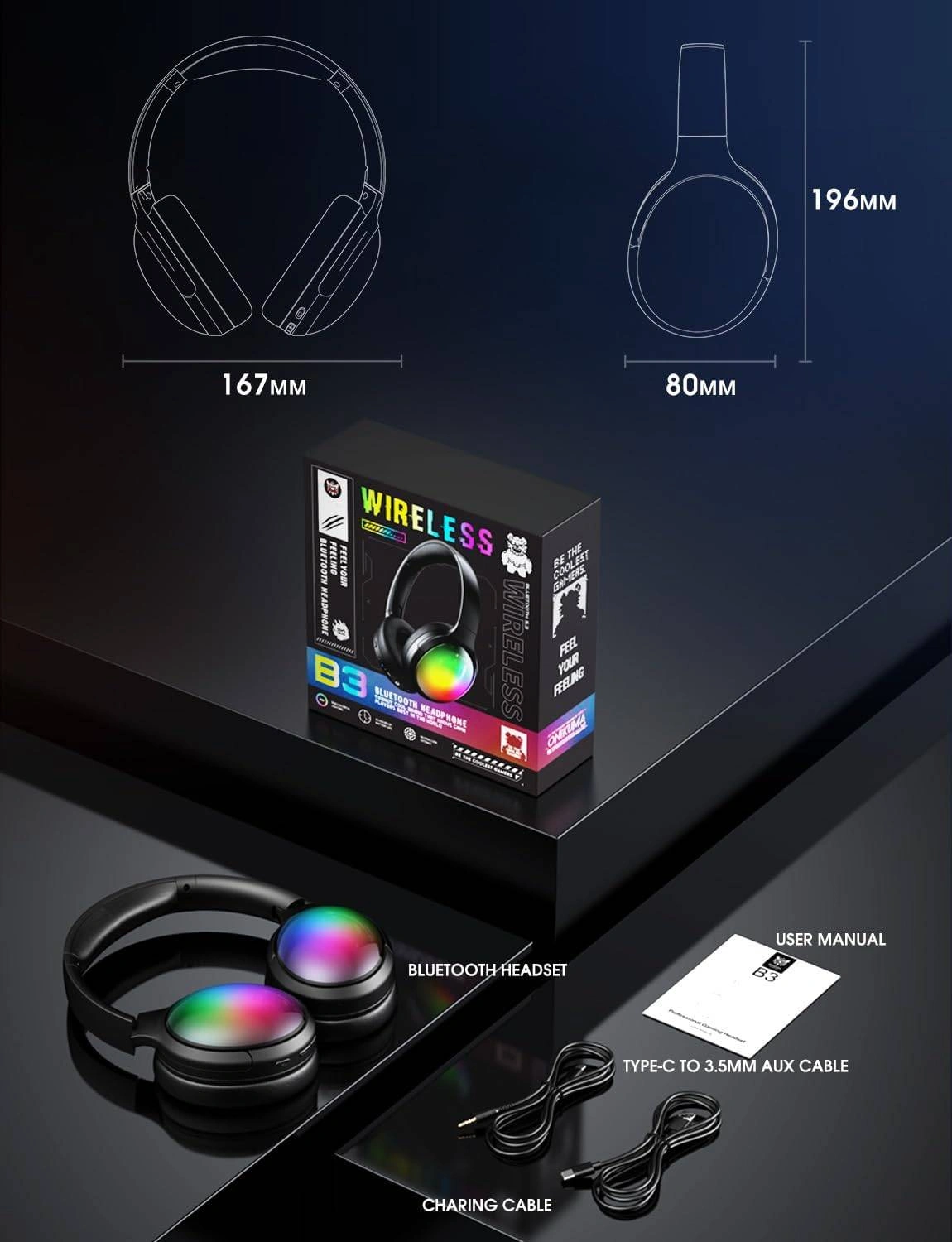 【Wireless Freedom & Wired Option】The rgb Bluetooth headphone supports Bluetooth 5.3 and AUX wired connection, you can enjoythe flexibility of wireless/wired dual mode. Up to 45 hours of battery life(light off) and10 hours playback time(light on).