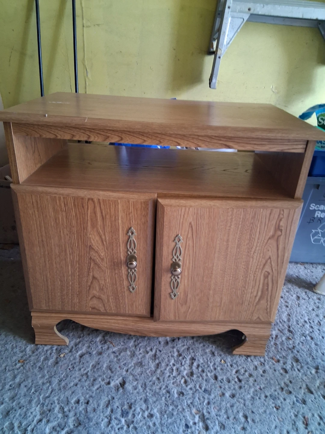 Selling a sturdy TV stand or sideboard with an oak veneer finish. It features two doors with decorative handles and an open shelf for storage. Perfect for a living room or bedroom!