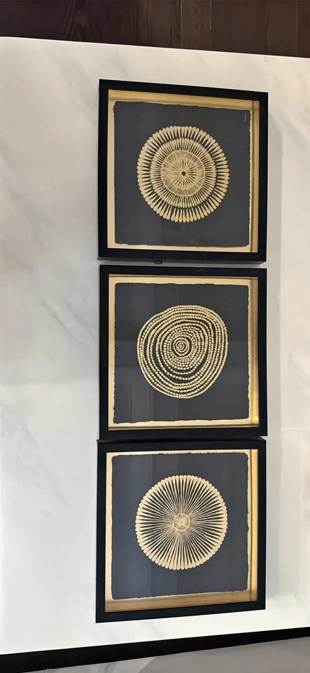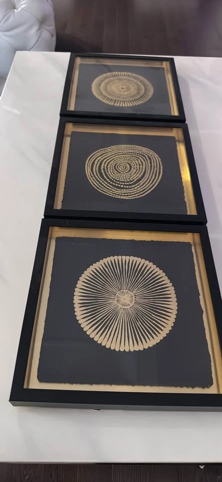 Beautiful black and gold art prints in matching black frames with gold borders. Each print has a unique circular design. Frames are in new condition.