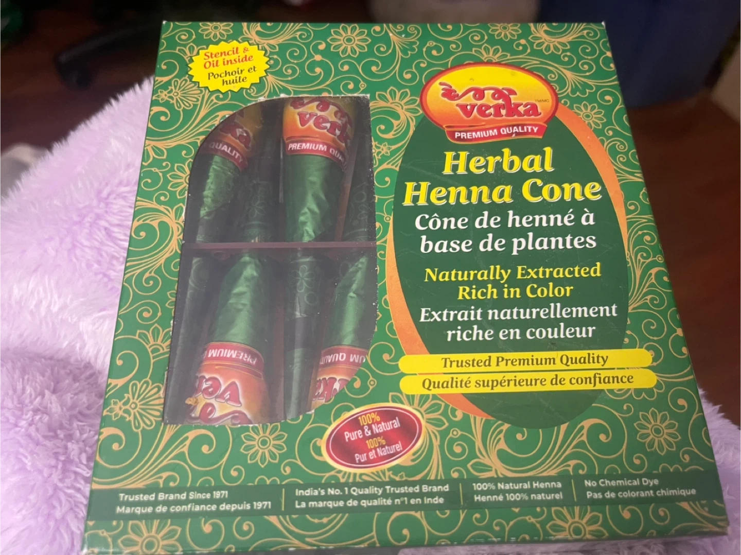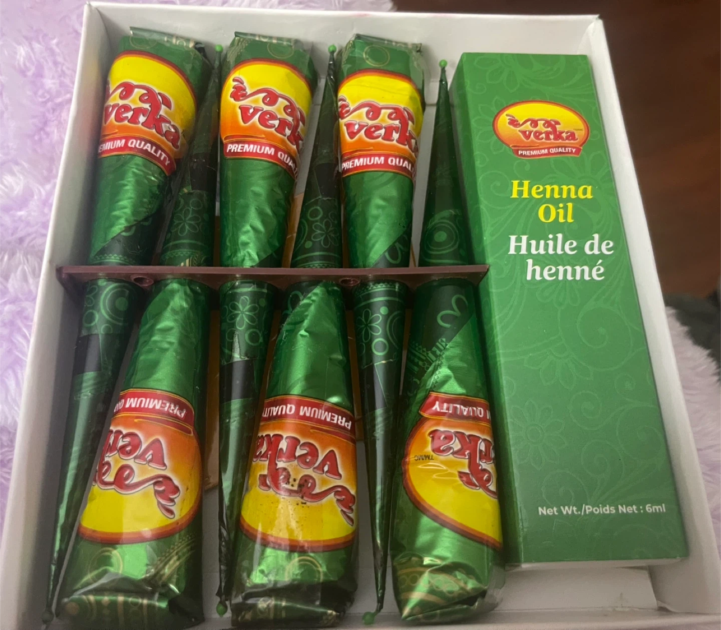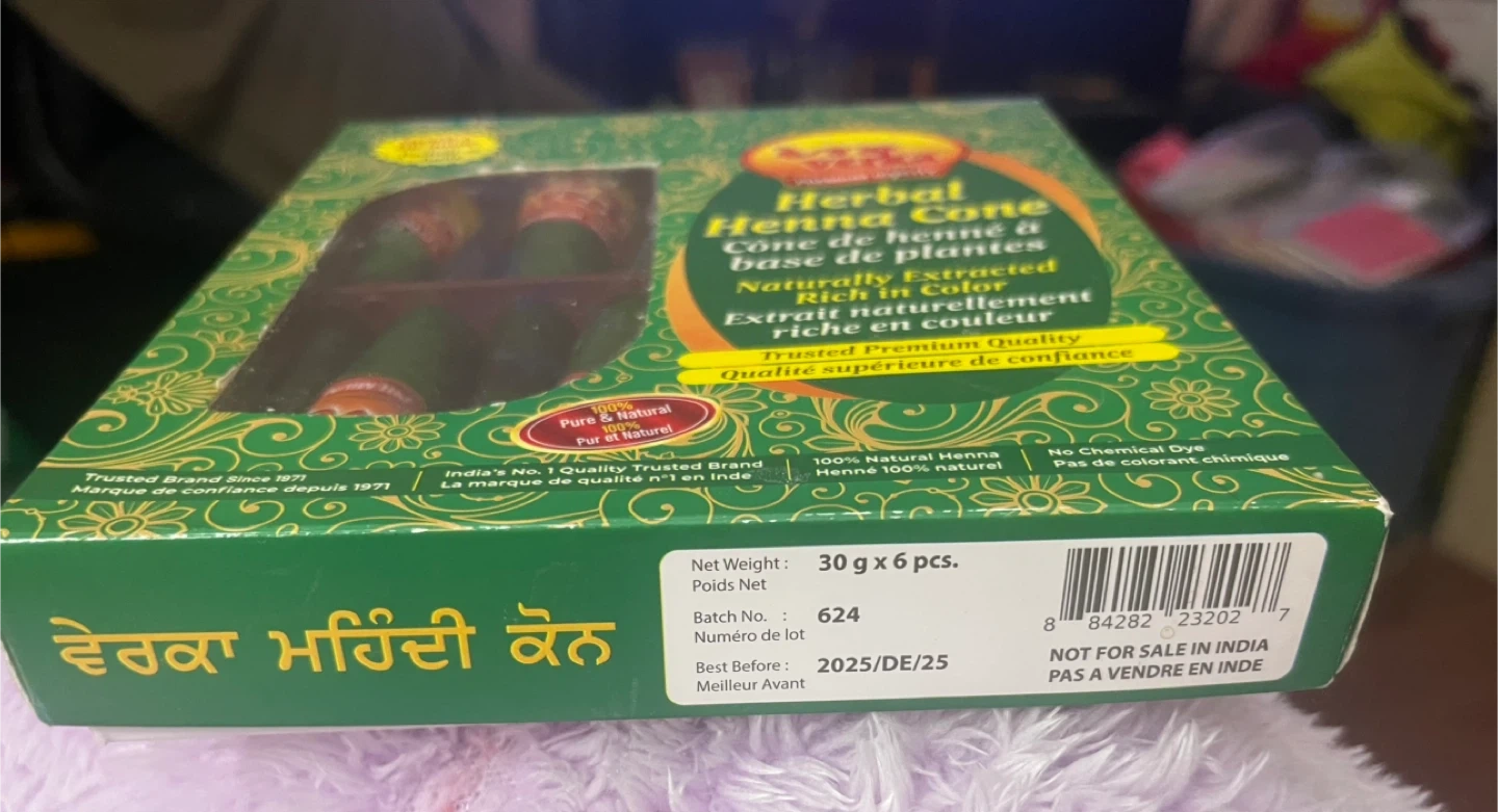 Selling a Verka Herbal Henna Cone set! It comes with 6 henna cones and henna oil. The cones are naturally extracted and rich in colour. It's 100% pure and natural henna, with no chemical dyes. Best before 2025 December 25