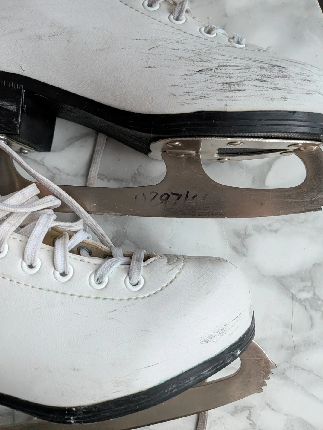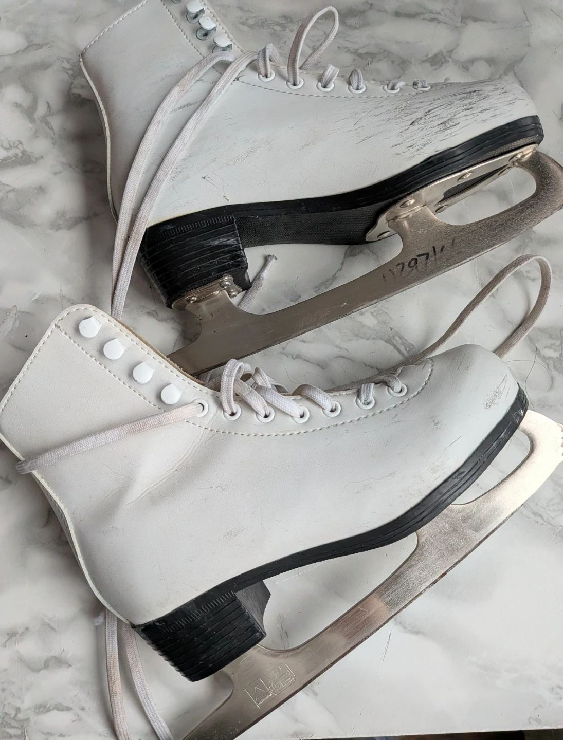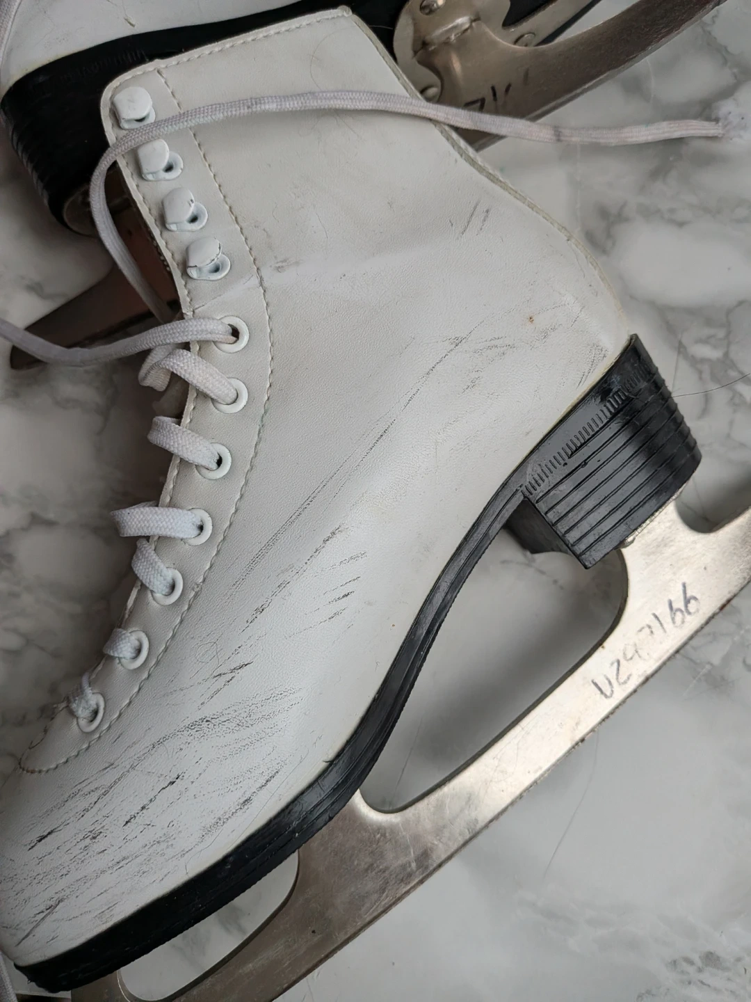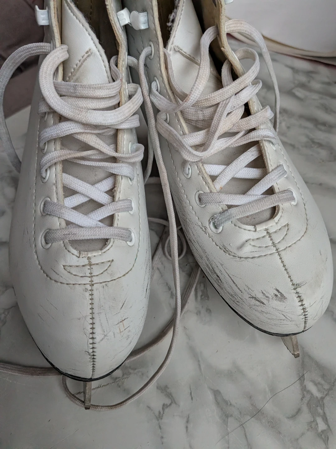 Selling a pair of white figure skates, size girls 3. They have some scuffs and scratches from use. Blades are in great shape. Great for beginners or recreational skaters looking for a budget-friendly option