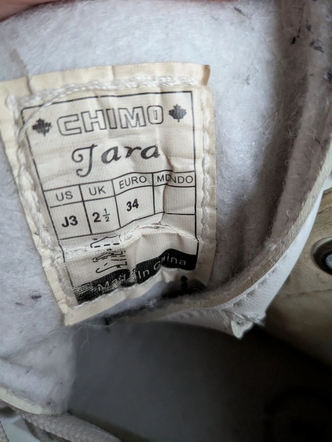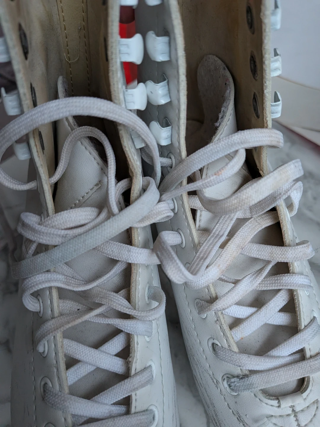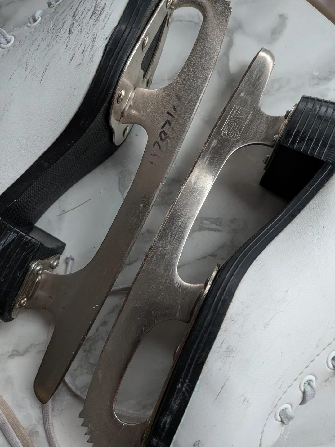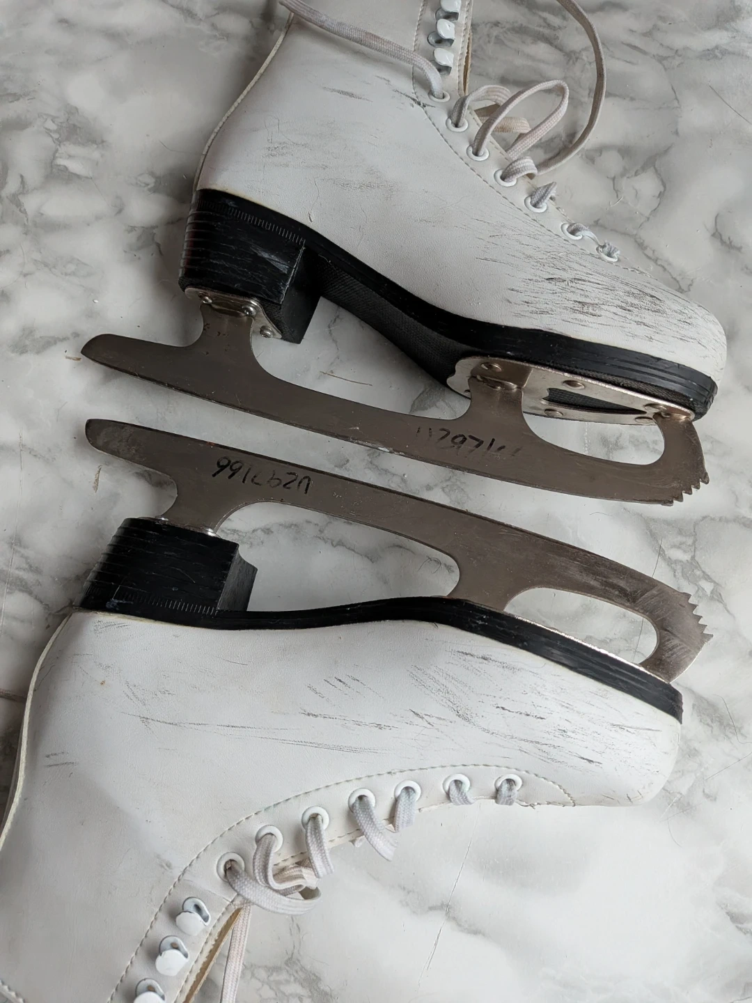 Selling a pair of white figure skates, size girls 3. They have some scuffs and scratches from use. Blades are in great shape. Great for beginners or recreational skaters looking for a budget-friendly option