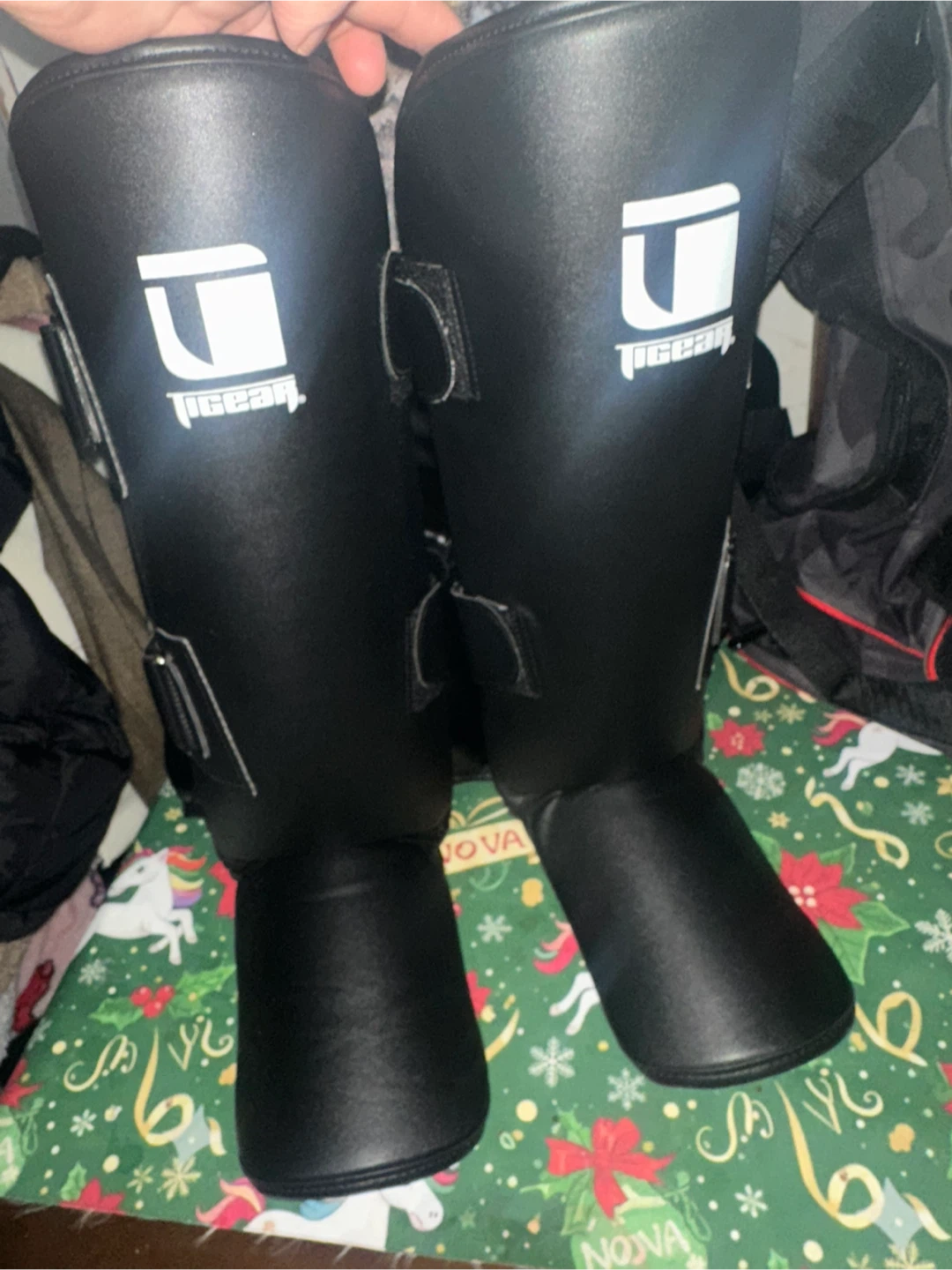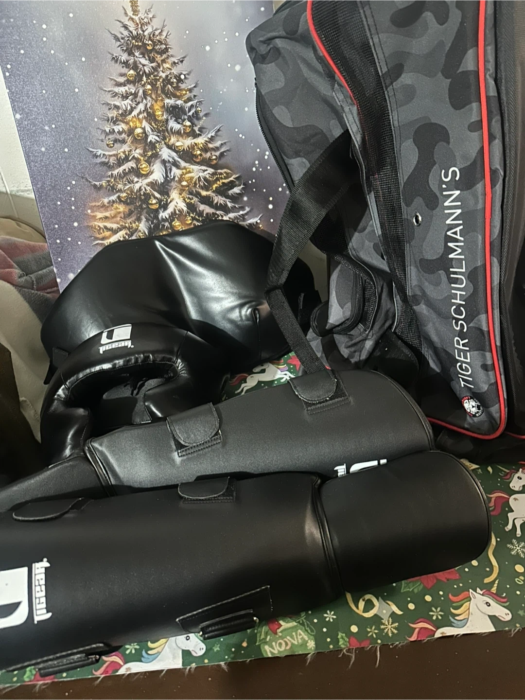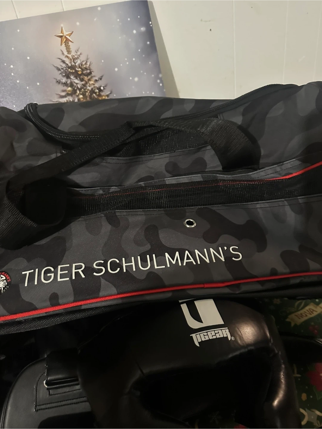Selling a set of boxing gear that includes a Tiger Schulmann's duffel bag and T Gear headgear and shin guards. All items are in good condition and ready for use. Great for anyone getting into martial arts!