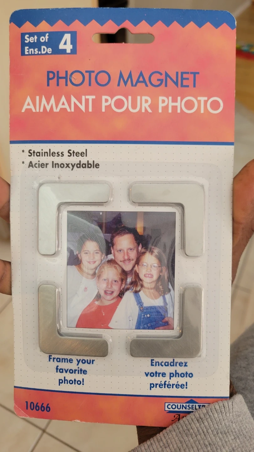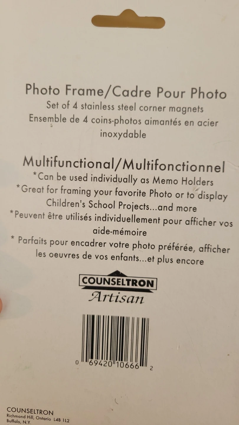 Selling a set of 4 Counseltron Artisan photo frame magnets! These stainless steel corner magnets are perfect for framing your favourite photos or displaying children's school projects. They can also be used individually as memo holders. Get creative with these multifunctional magnets!
