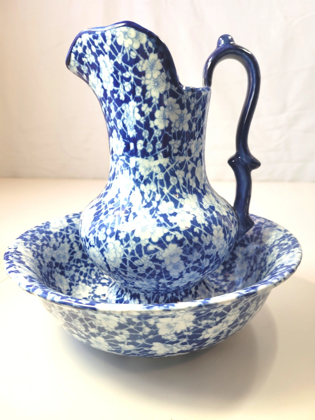 Ironstone Flow Blue Pitcher and Bowl Set Vintage Reproduction