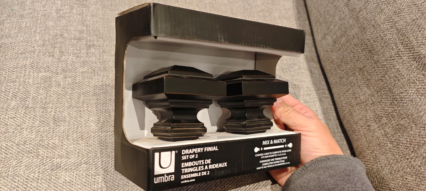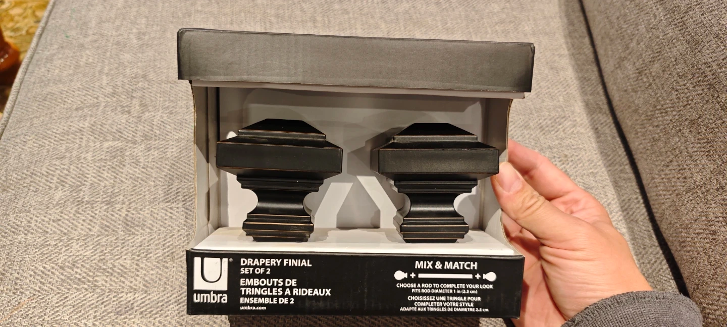 Selling a brand new set of Umbra drapery finials, still in the original box! This set comes with 2 finials, perfect for adding a touch of style to your curtains. They're designed to fit rods with a diameter of up to 2.5 cm. Mix and match to complete your look!