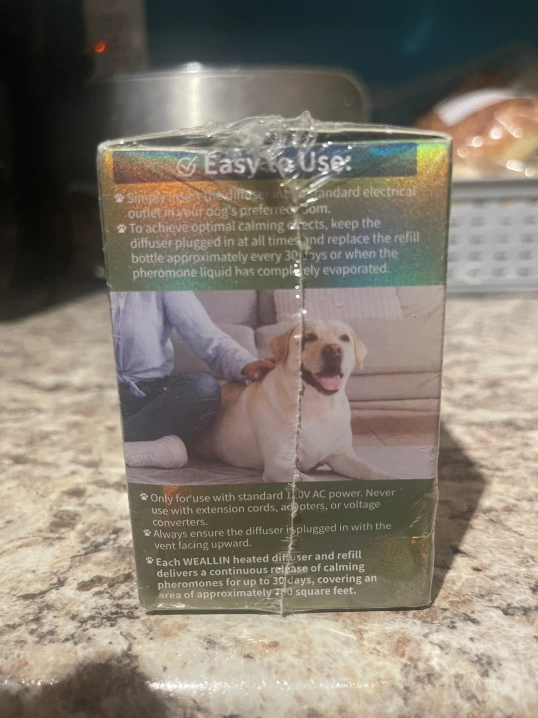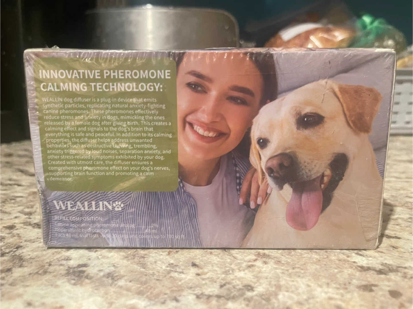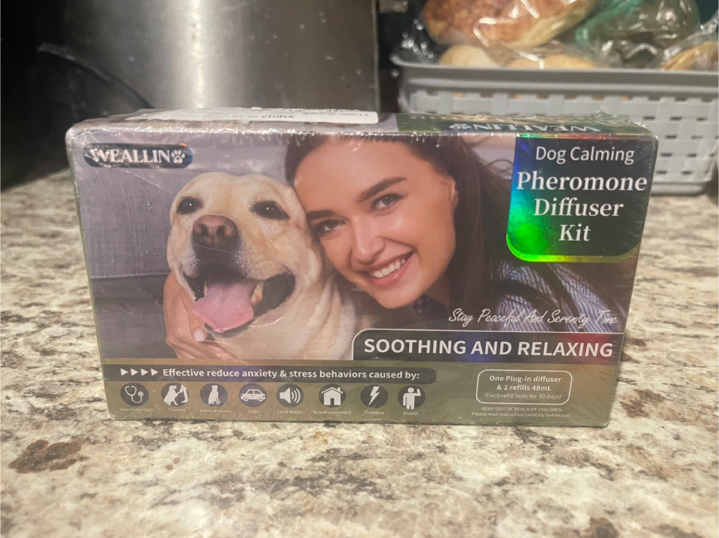 Selling a WEALLIN Dog Calming Pheromone Diffuser Kit. It's designed to help reduce anxiety and stress behaviours in dogs. The diffuser covers an area of approximately 700 square feet and lasts up to 30 days.