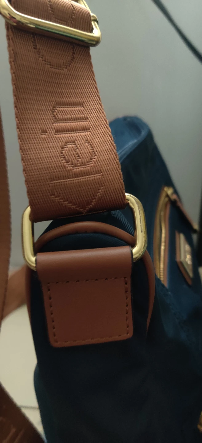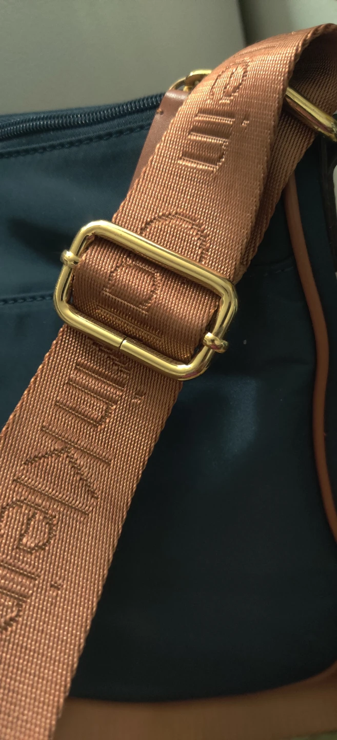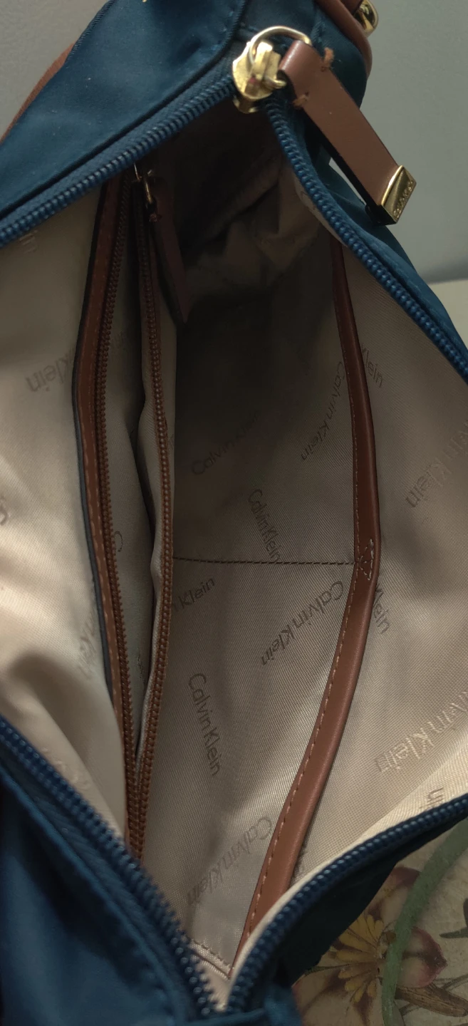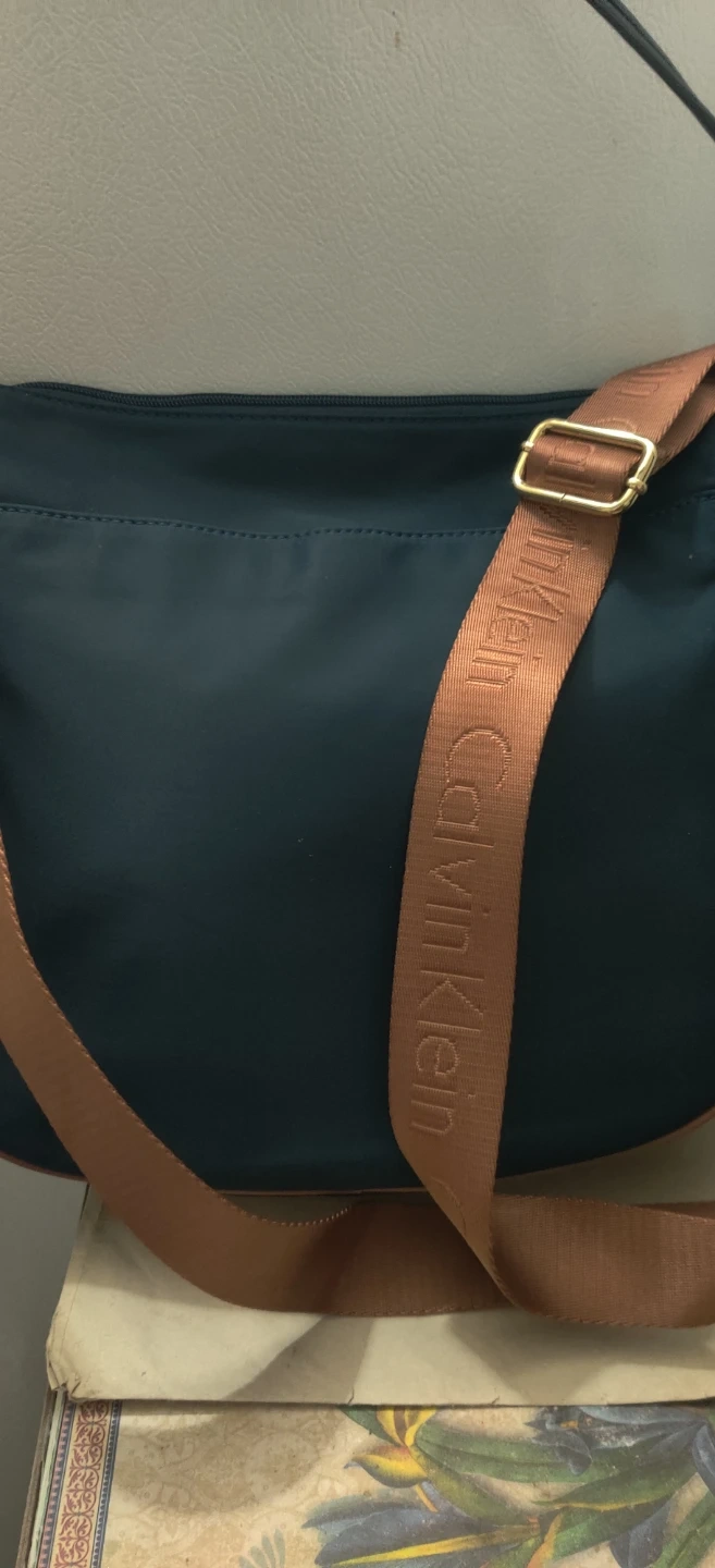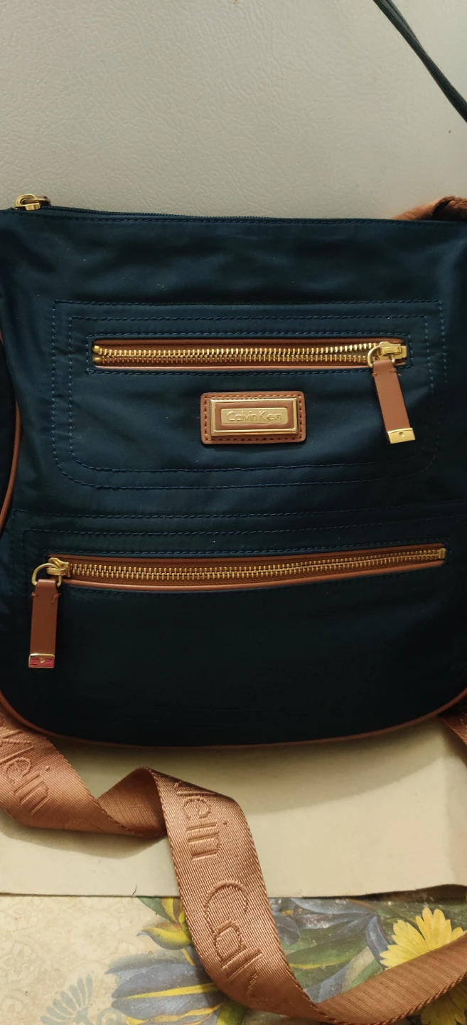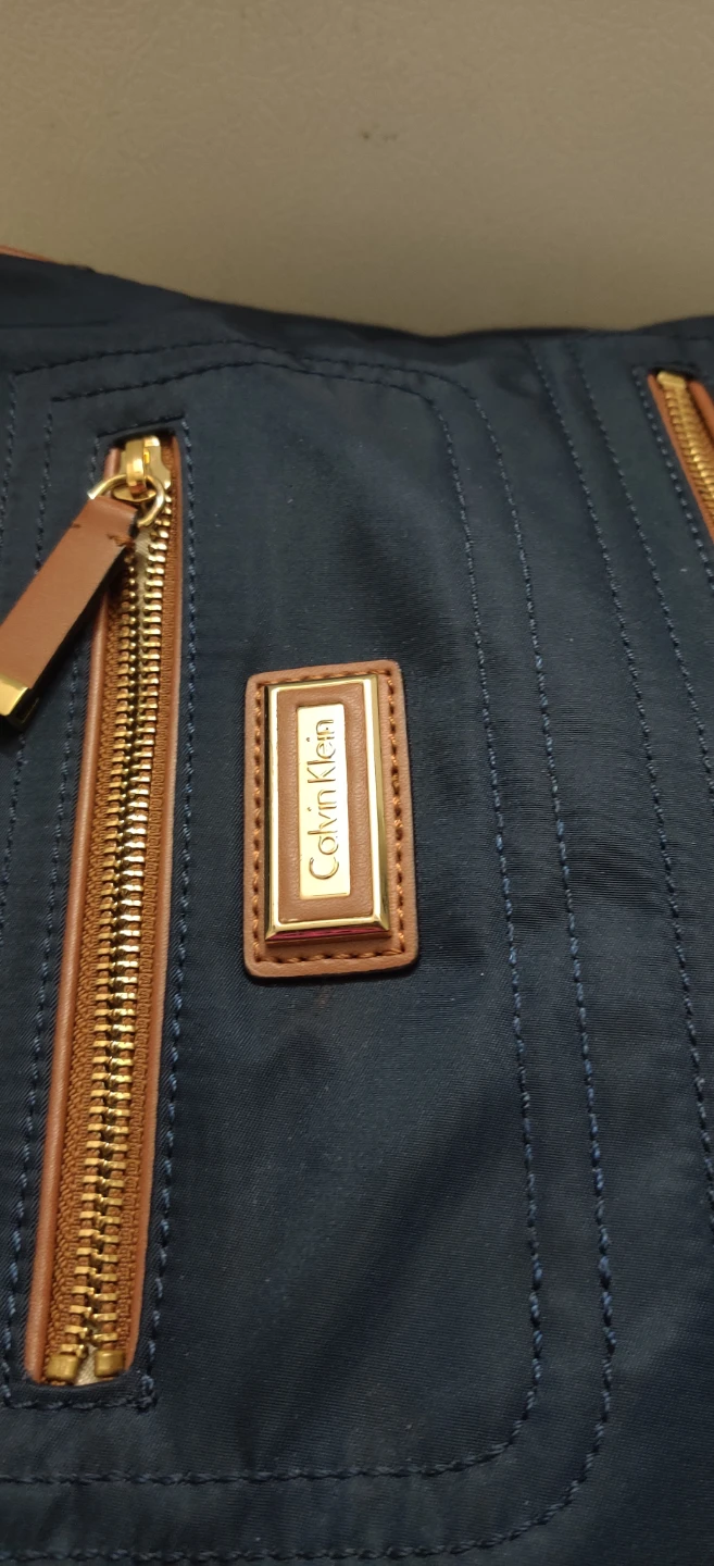Here's a Calvin Klein crossbody bag in navy. It has a brown strap with the Calvin Klein logo printed on it. It's a stylish and practical bag for everyday use!Sorry No hold/ reservations on this item.Please check for availability when you are able to pick up