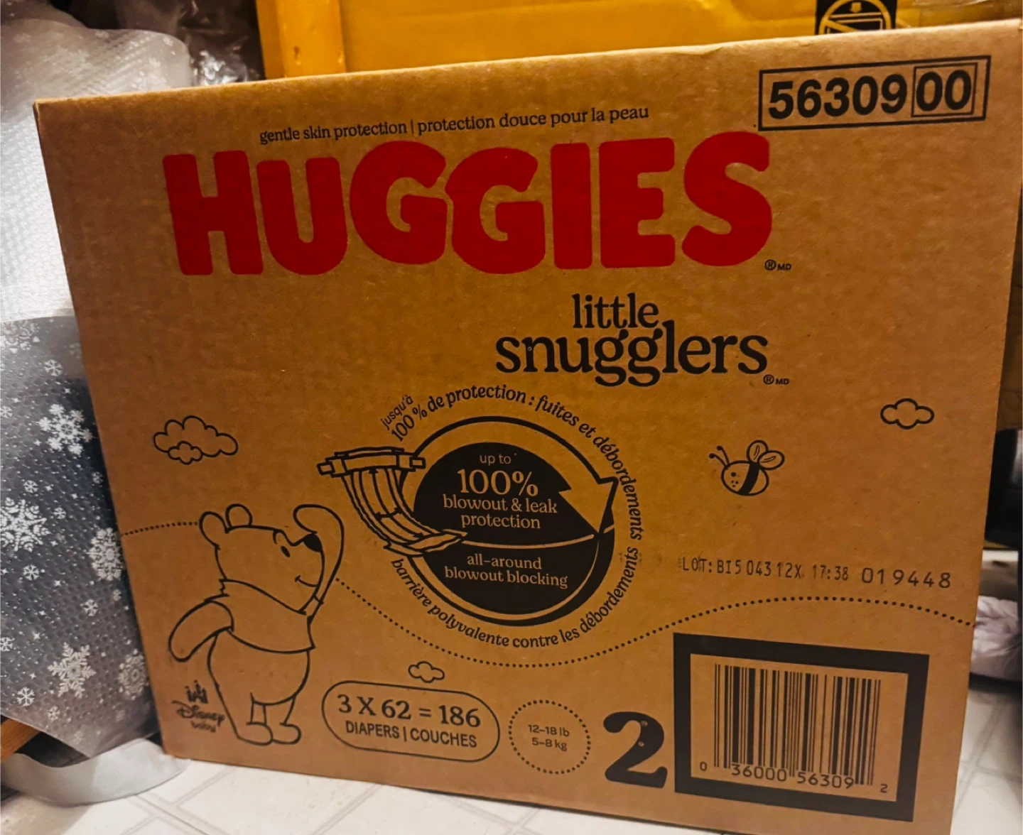 Selling a box of Huggies Little Snugglers diapers, size 2! There are 186 diapers in the box, perfect for babies 12-18 lbs (5-8 kg). These diapers offer up to 100% blowout and leak protection with all-around blowout blocking. Gentle on skin!