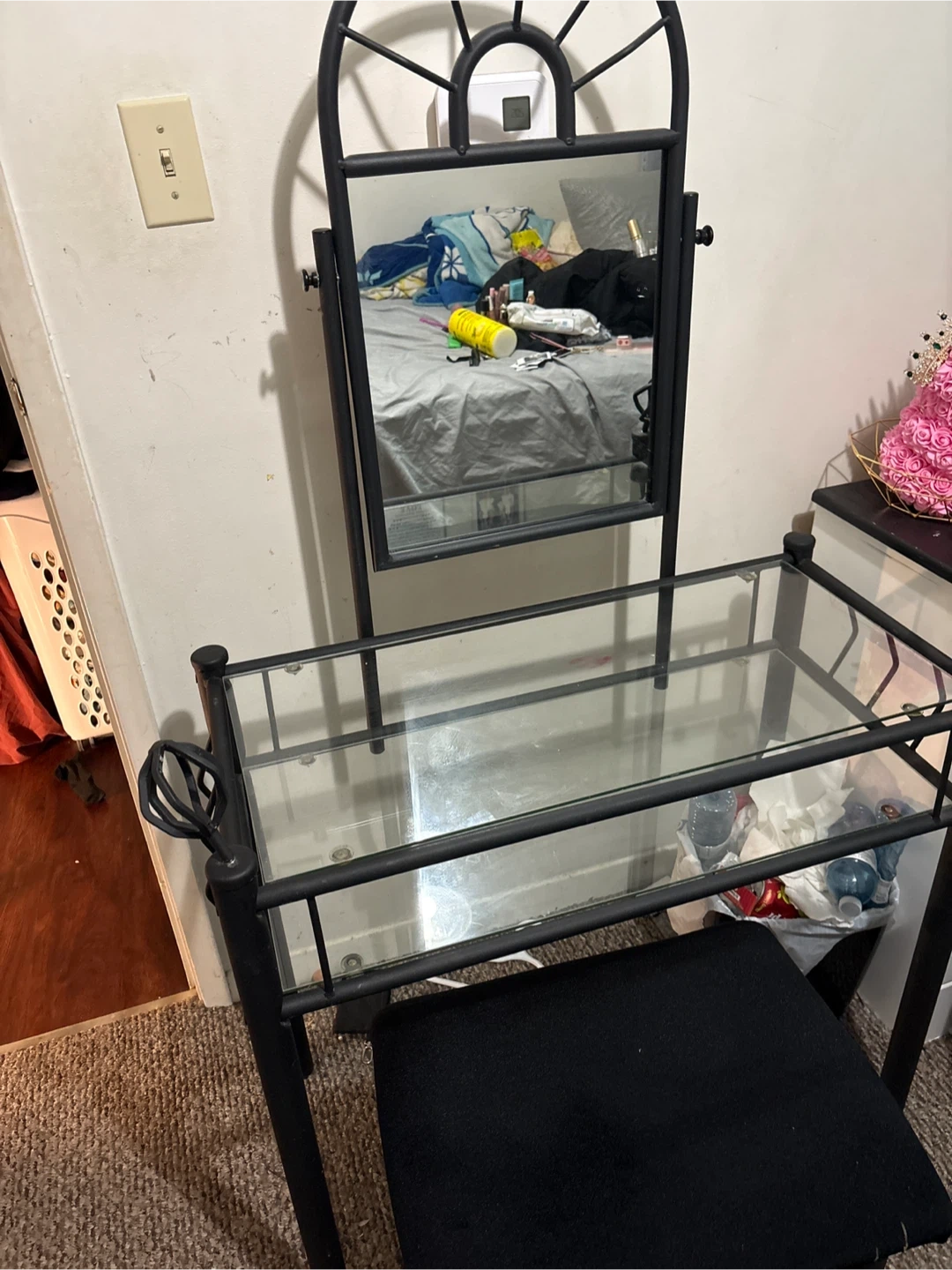 Selling a vanity table in great condition! It features a black metal frame, a glass top, and comes with a matching stool with a black cushion. It's perfect for getting ready in the morning or adding a touch of elegance to your space