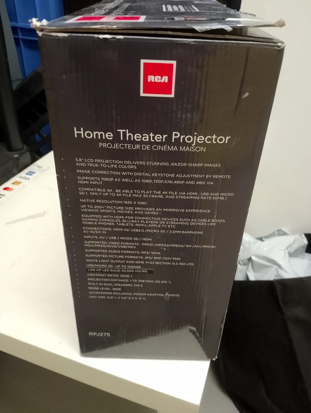 Selling a RCA Home Theater Projector, model RPJ275! It delivers stunning, razor-sharp images and true-to-life colors. It supports image correction with digital keystone adjustment by remote. It is compatible with 4K and can play 4K files via HDMI, USB and Micro SD. It has a native resolution of 1920 x 1080. The light bulb has a life of 50,000 hours. The box includes the projector, remote and power adaptor