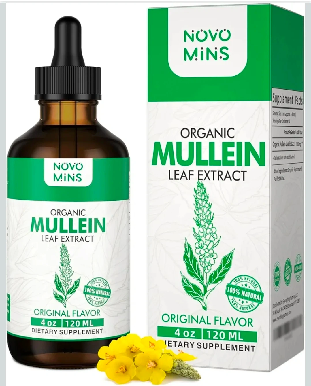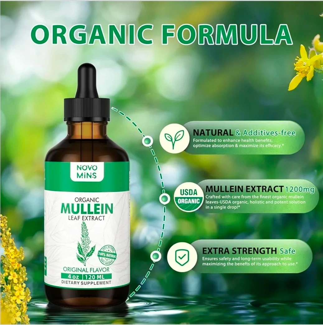 Selling a bottle of Novo Mins Organic Mullein Leaf Extract. It's a dietary supplement with 4 oz (120 mL) of the original flavor. It's formulated to enhance health benefits and optimize absorption. It's crafted with care from the finest organic mullein leaves and is USDA organic. It's extra strength and ensures safety and long-term usability.