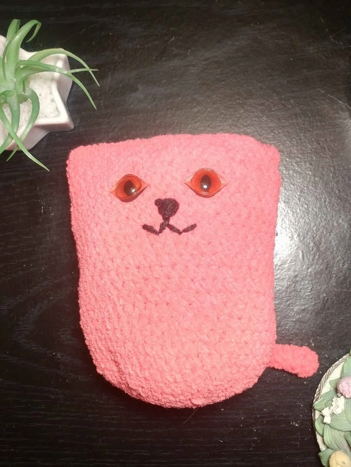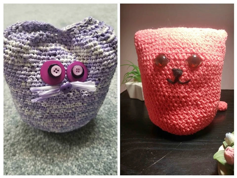One crochet cat with soft yarn the other is made with recycled plarn (plastic yarn.) From a household with cats