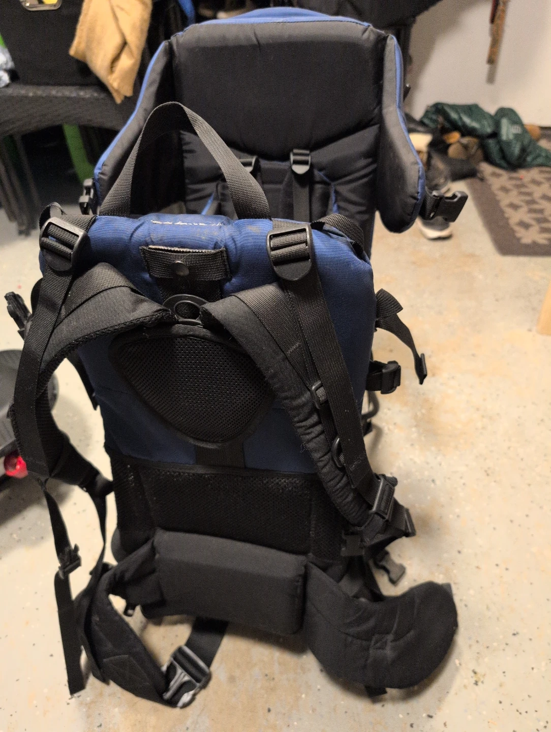 Selling a Mountain Equipment Coop (MEC) child carrier. It's in good shape and ready for your next outdoor adventure with your little one! The carrier is blue and black.