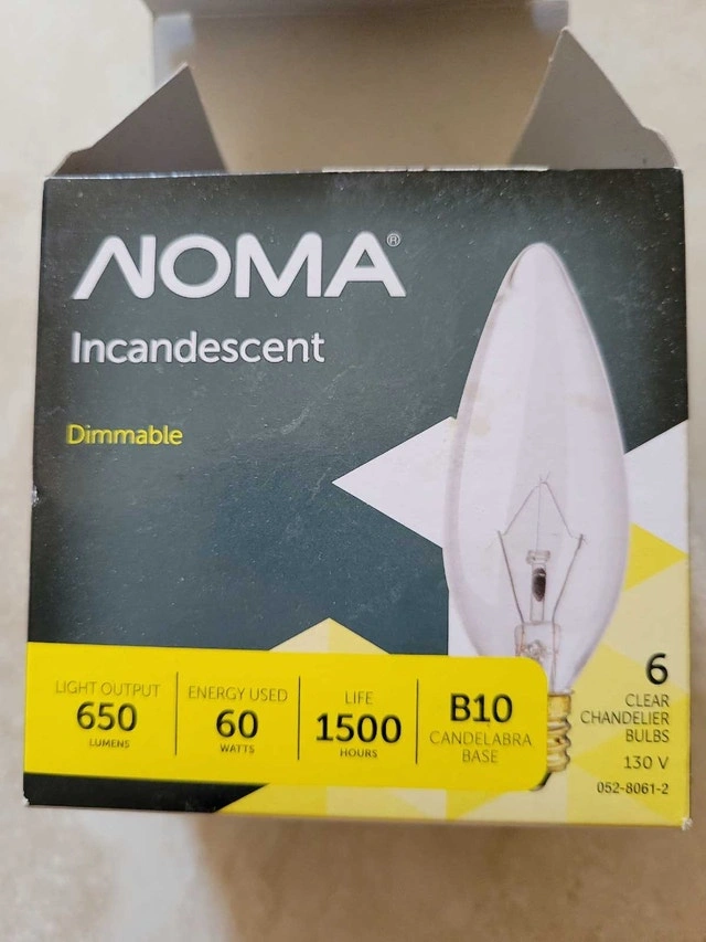 I'm selling new NOMA 60W Incandescent Chandelier Bulbs. These dimmable bulbs provide 650 lumens of light output and have a B10 candelabra base, with a life of 1500 hours. Only 3 bulbs.