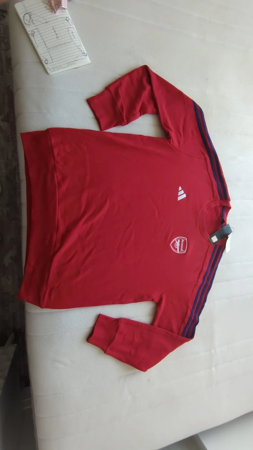 Arsenal logo on the front and Adidas stripes on the sleeves. It's in brand new condition with original tags.
