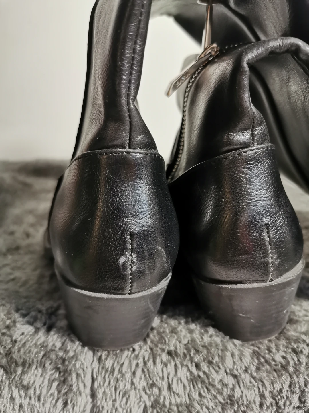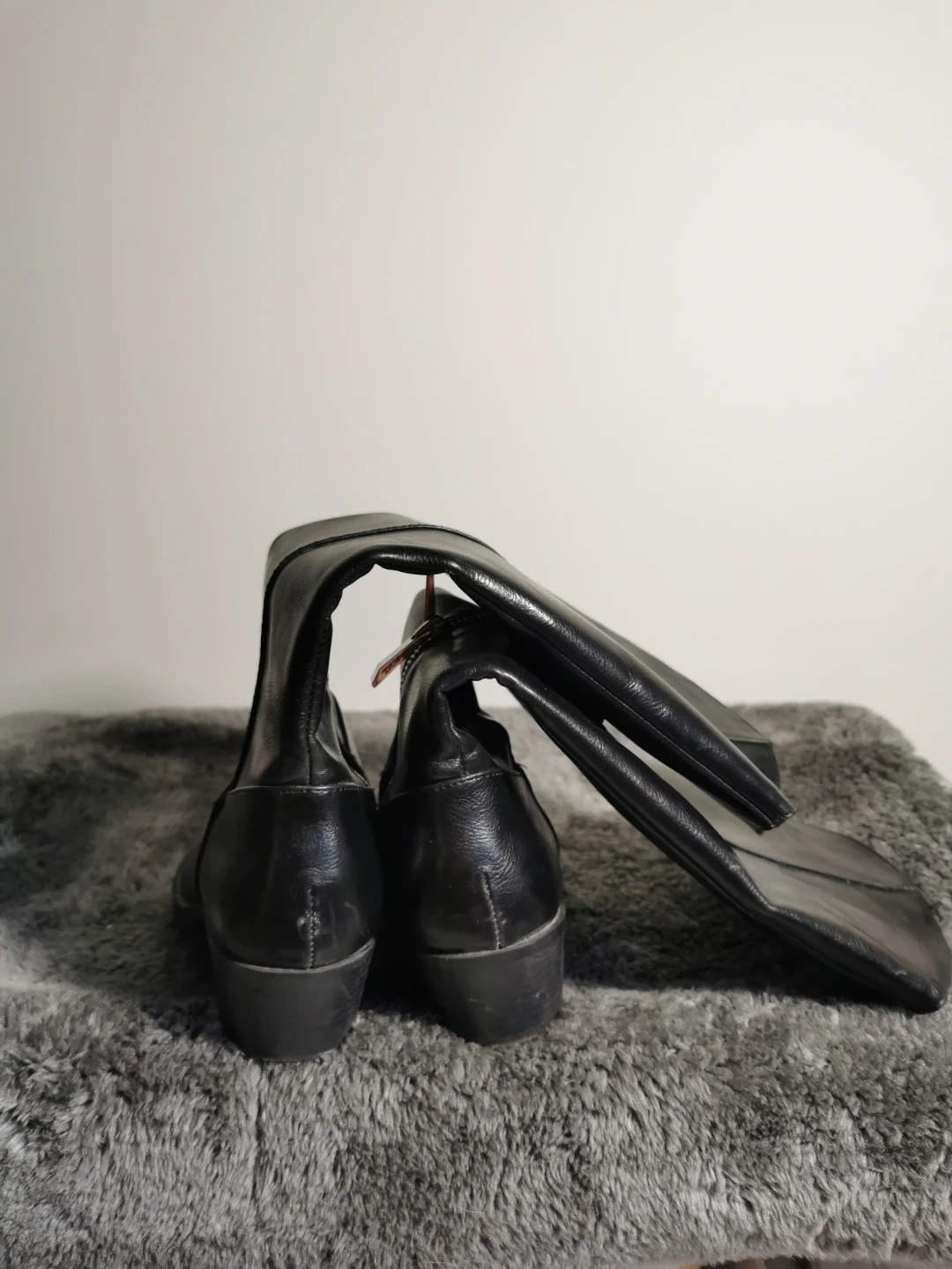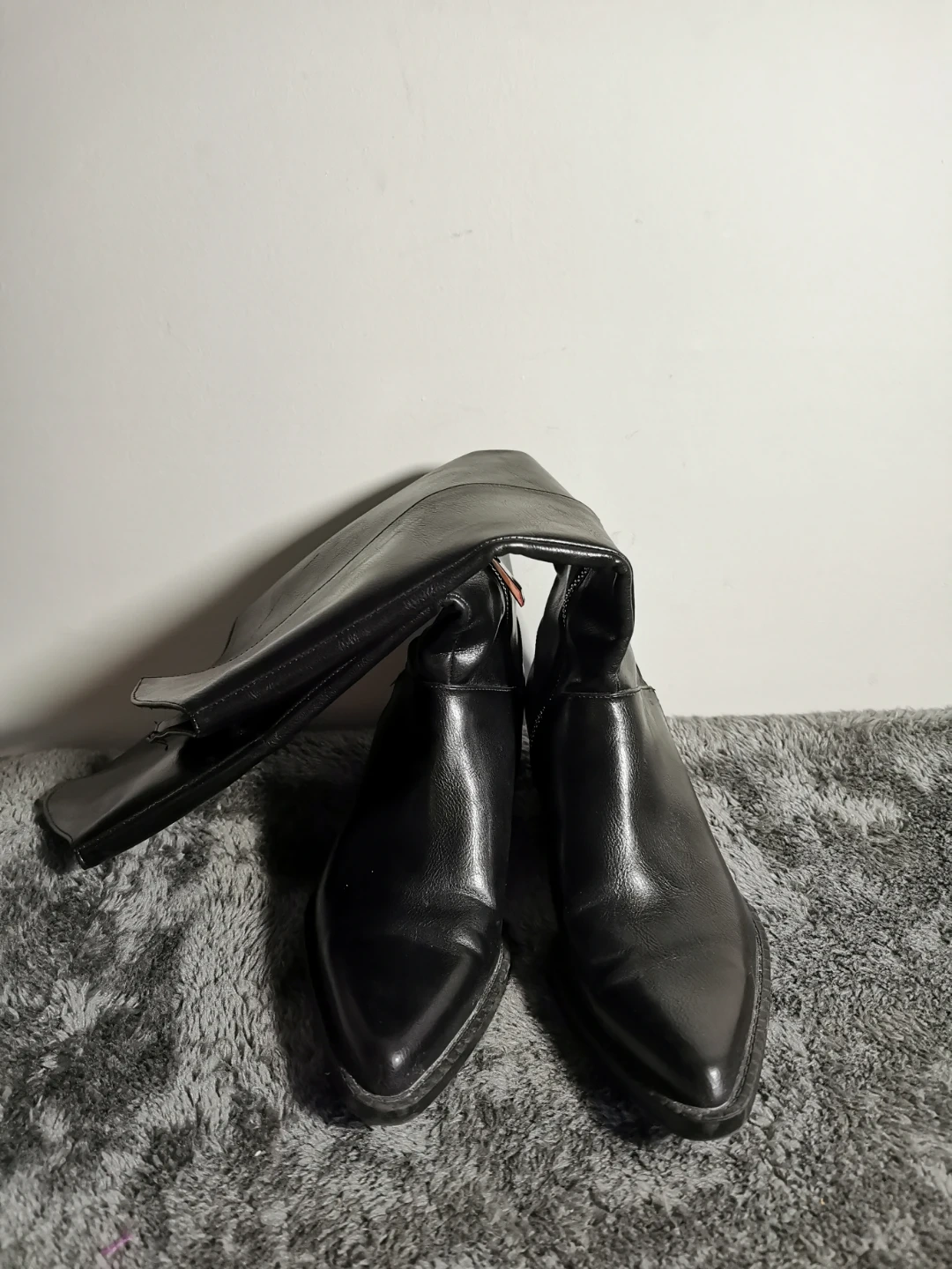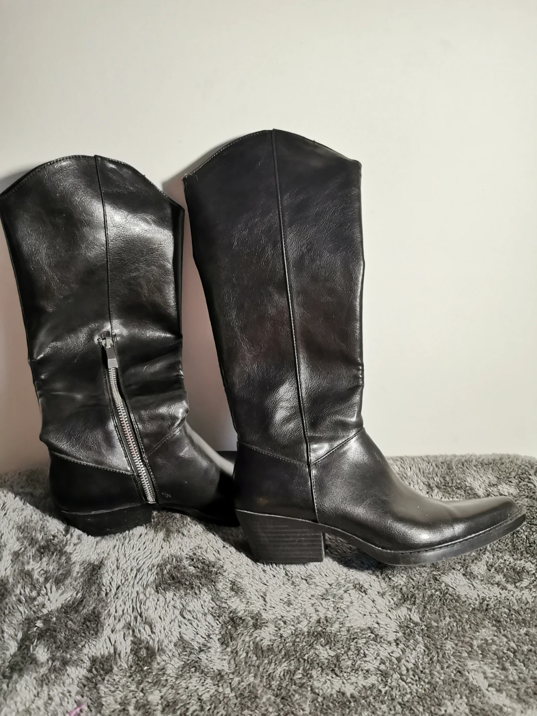 Selling a pair of black leather cowboy boots. They are in good condition and have a classic look! They would be great for everyday wear or a night out. Minor wear and light scuffing on back of the boots