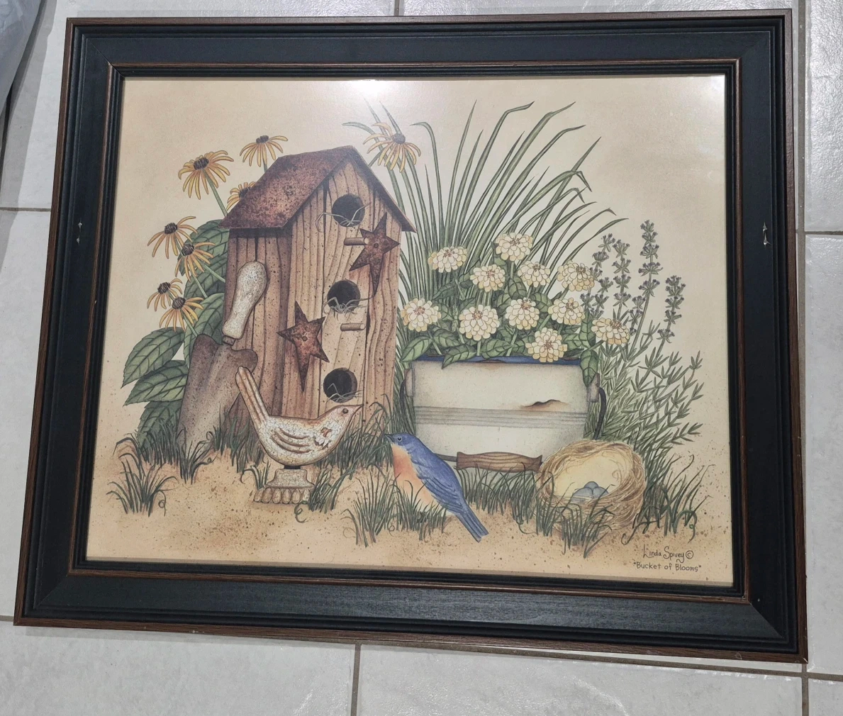 Here's a framed print of a piece called 'Bucket of Blooms' by Laurie Speltz! It's in great condition and would look lovely in any room. Beautiful green frames.