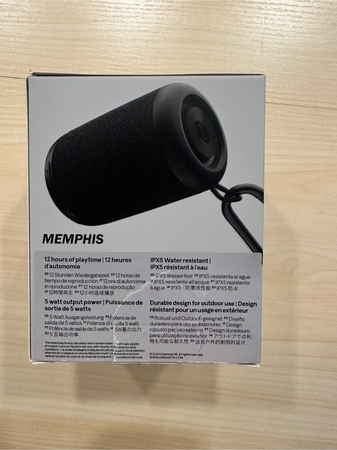 Selling a portable Bluetooth speaker by Urbanista, the Memphis model in Midnight Black. It's water resistant with an IPX5 rating, so it's durable for outdoor use. It has 12 hours of playtime and a powerful 5-watt output. Comes with the original box