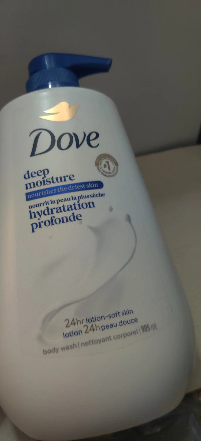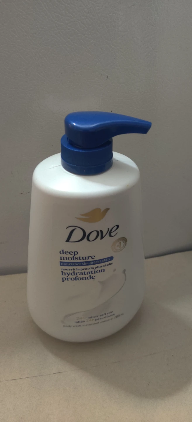 Selling a bottle of Dove Deep Moisture body wash. It's a generous 905 mL size, perfect for keeping your skin feeling soft and hydrated.