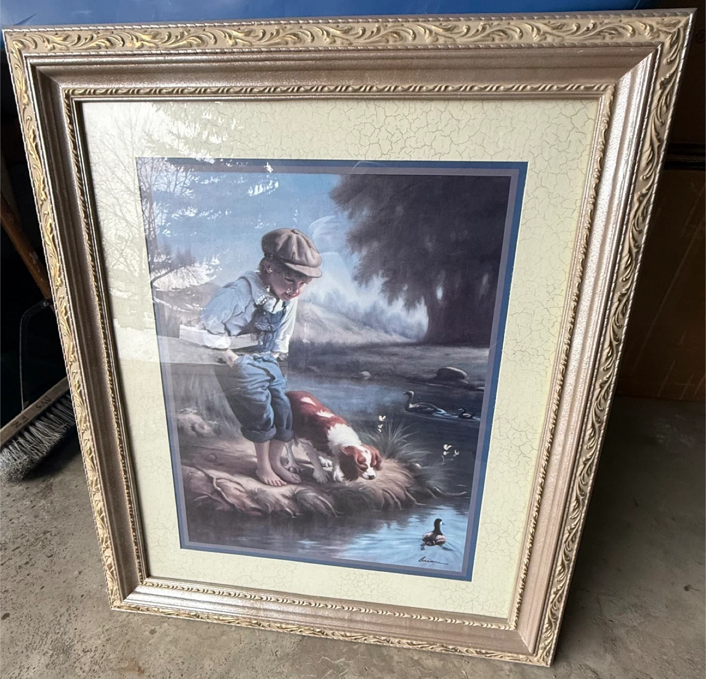 A framed print featuring a boy, a dog, and some ducks in a pond. The frame is a decorative gold colour. It's in good condition and ready to hang in your home!