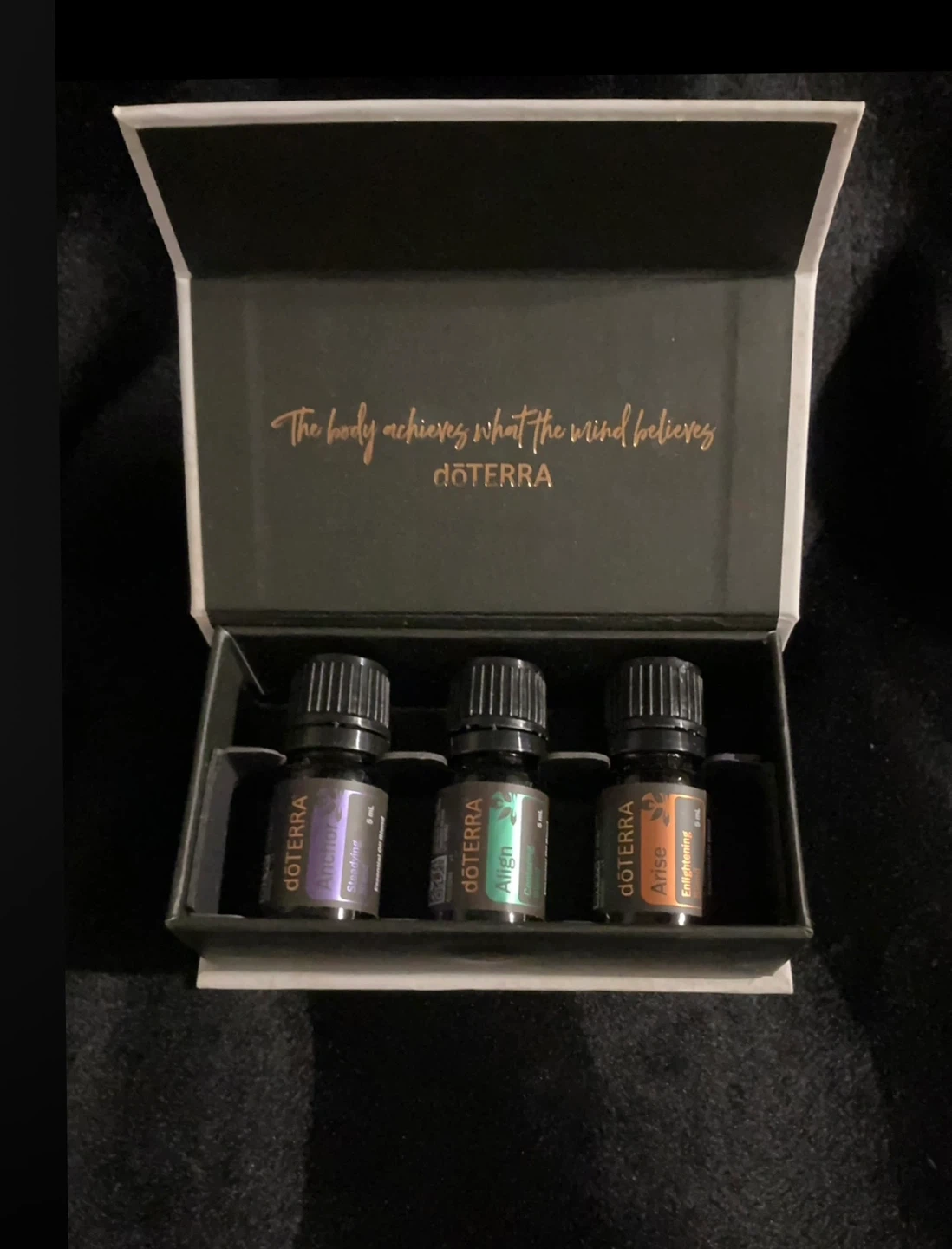 doTERRA Yoga Collection, which includes three 5 mL bottles of essential oil blends: Arise, Align, and Anchor. The box is included. These blends are designed to enhance your yoga practice or for everyday use to promote feelings of stability, strength, and enlightenment.