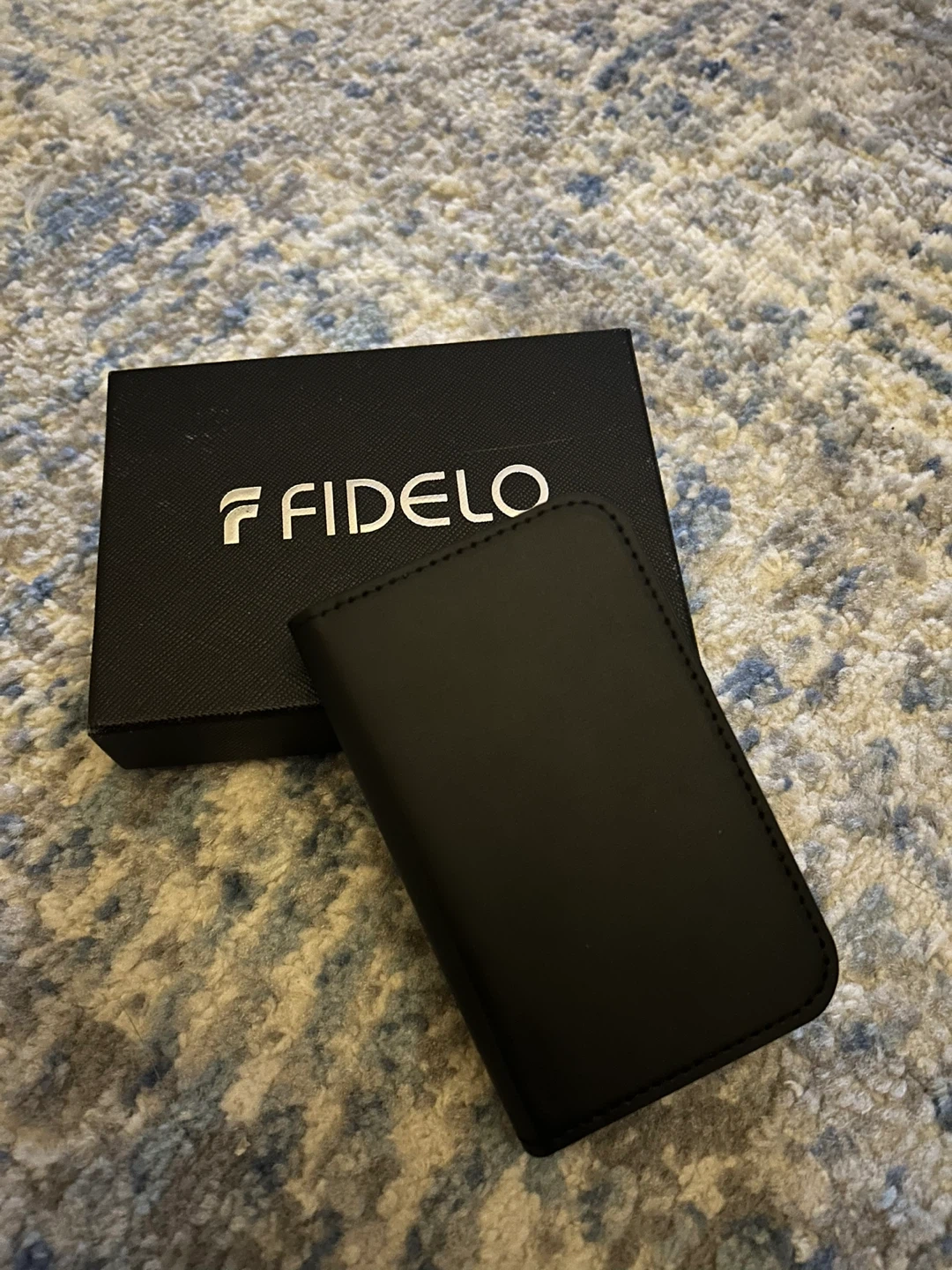 Selling a Fidelo slim wallet for men, in black leather! It features RFID blocking and a sliding pop-up design, perfect for front pocket use. The wallet can hold up to 6 cards and has a foldable design for extra space for bills. Dimensions are 4.4" x 2.0" x 0.6". Comes with the original box
