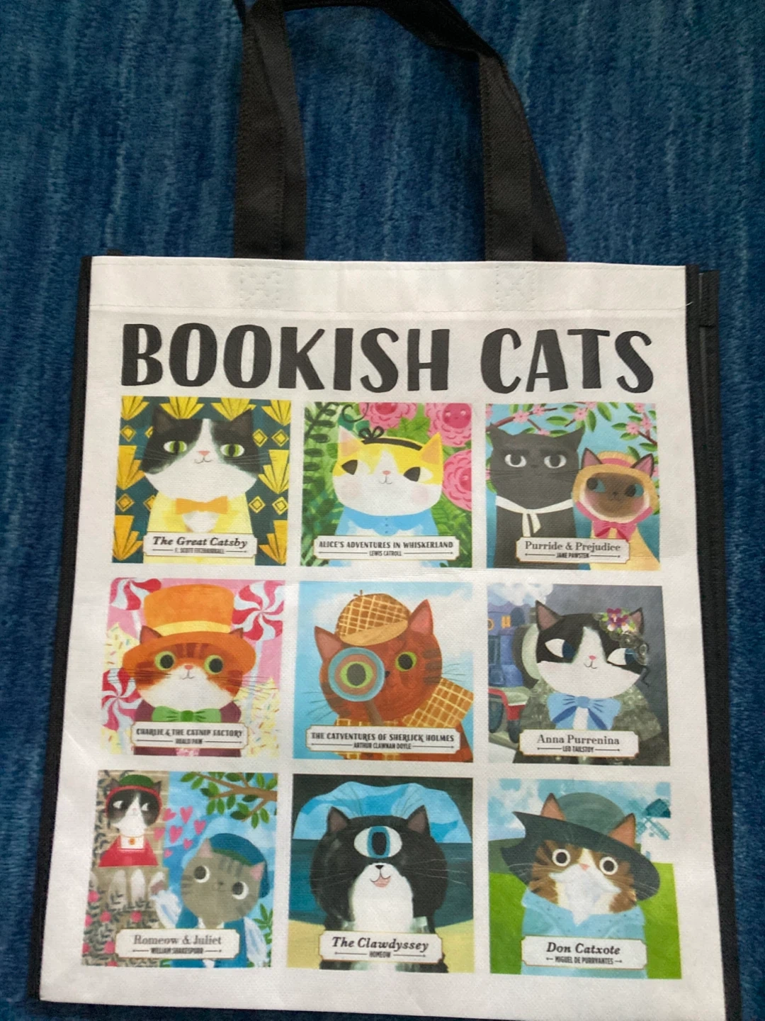 This brand new polyester tote bag features a variety of cats in book-related themes! It's perfect for carrying your books or groceries in humour and style. The bag features cats in titles such as The Great Catsby, Alice's Adventures in Whiskerland, Purride & Prejudice, Charlie & The Catnip Factory, The Catventures of Sherlick Holmes, Anna Purrenina, Romeow & Juliet, The Clawdyssey, and Don Catxote.