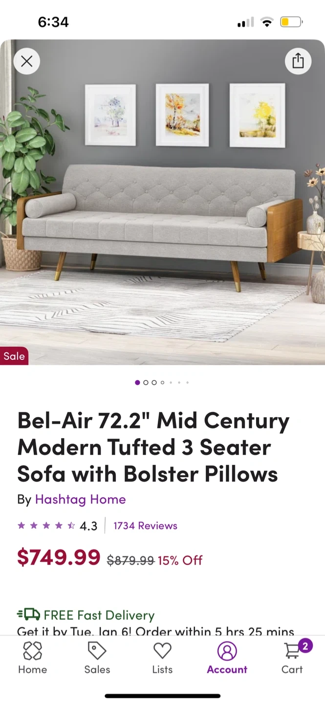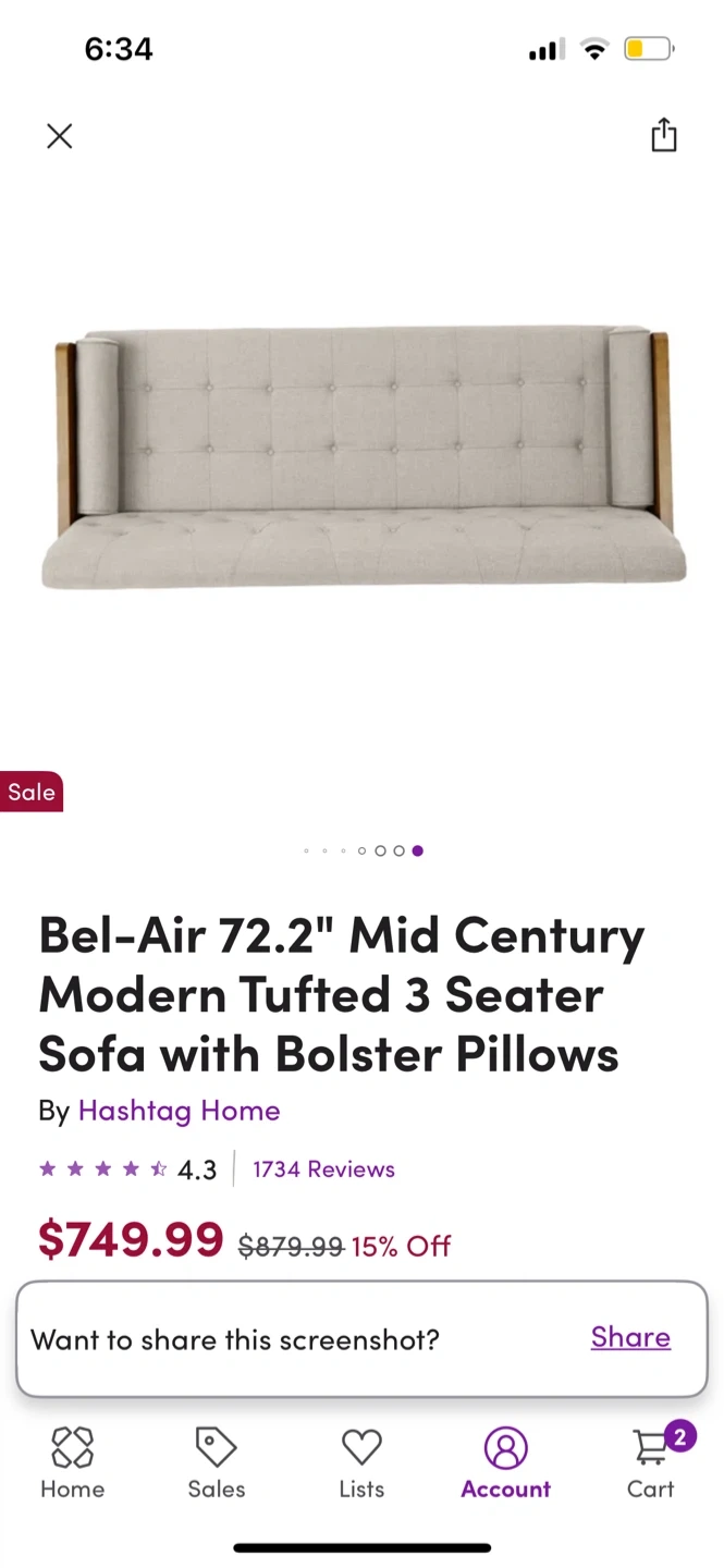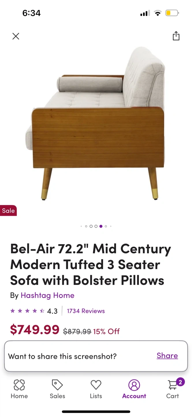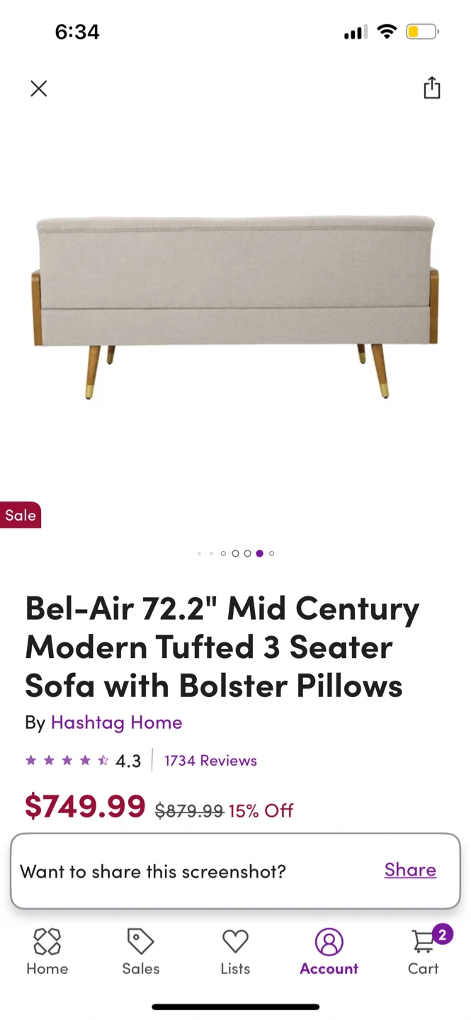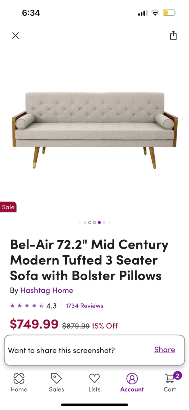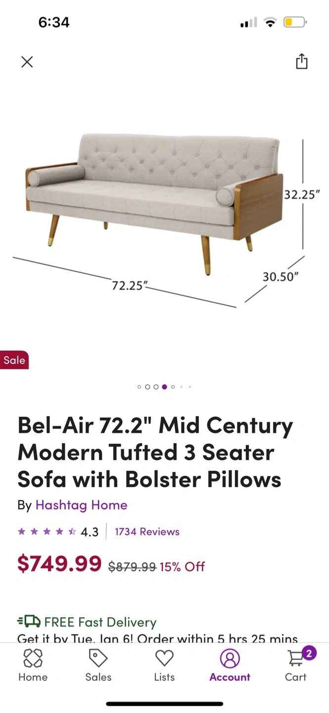 Selling a Home Bel-Air 72.2" Mid Century Modern Tufted 3 Seater Sofa with Bolster Pillows.