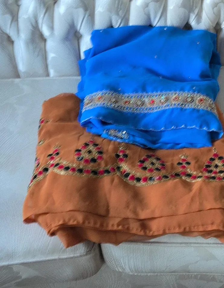 Selling two saris, one in a beautiful shade of blue and the other in a warm orange. Both feature intricate embroidery, adding a touch of elegance to any occasion. They are in great condition and ready for a new home!