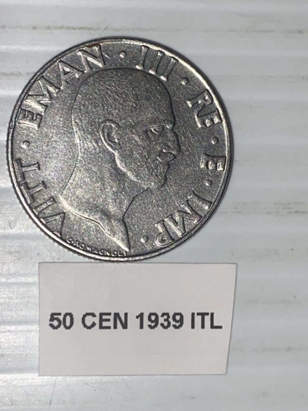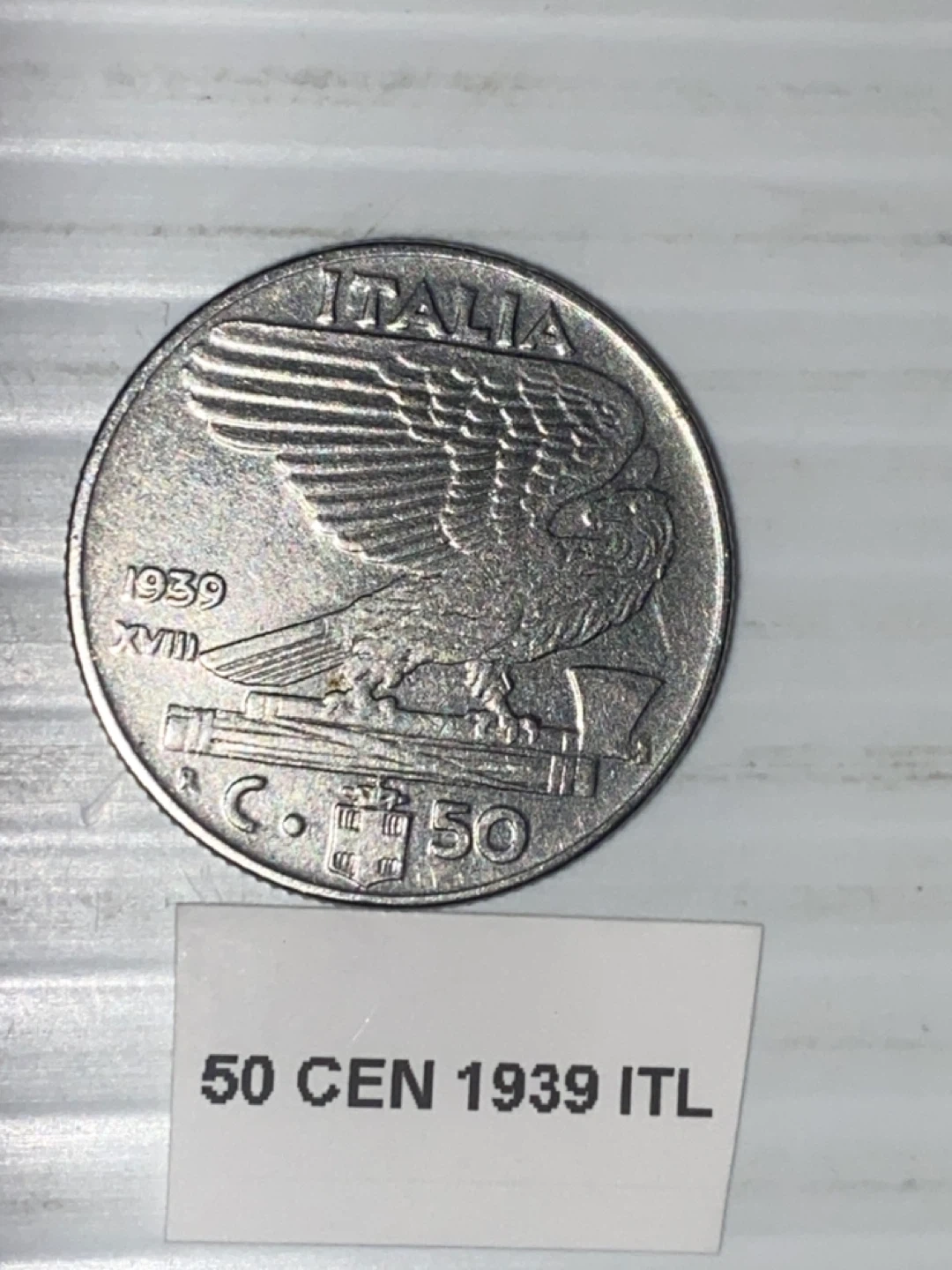 Selling a 1939 Italian 50 Centesimi coin. It features a detailed design with an eagle on one side and a portrait on the other. A great piece for collectors!