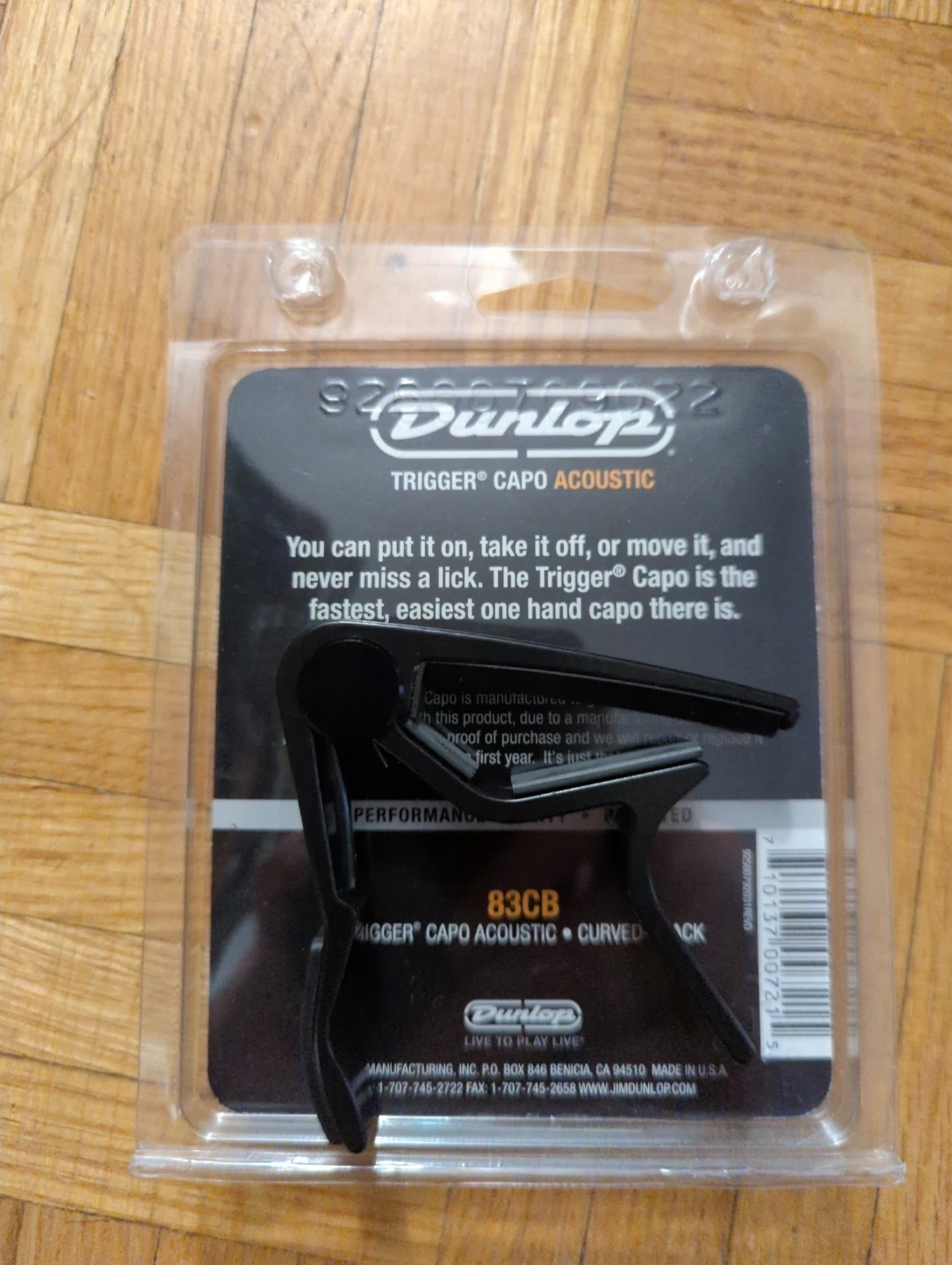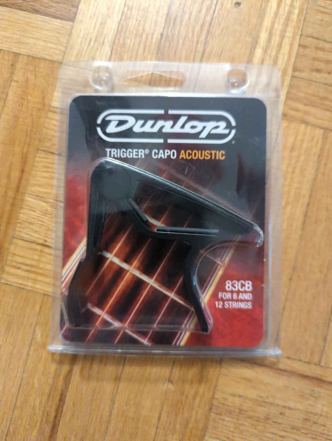 Selling a Dunlop Trigger Acoustic Capo, model 83CB. It's designed for both 6 and 12 string guitars. Black steel with rubber pads on contact points