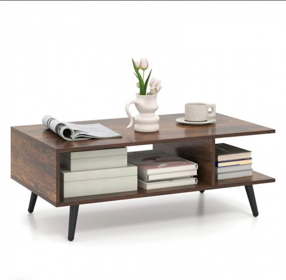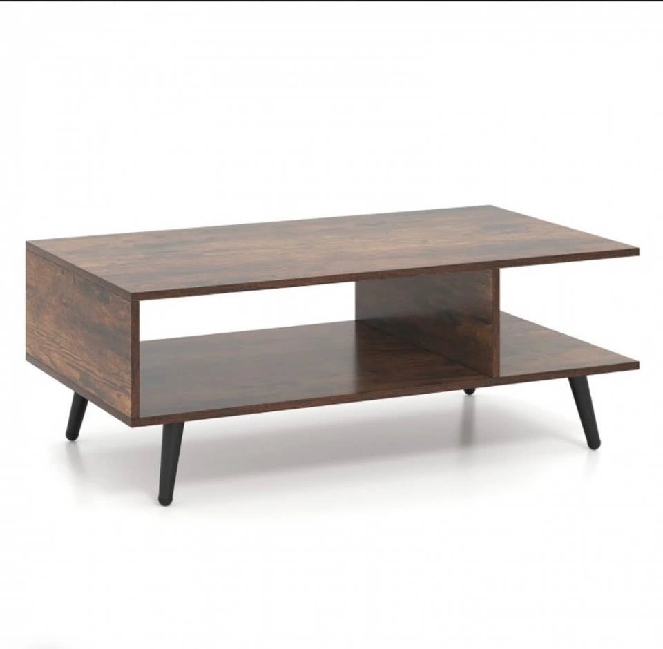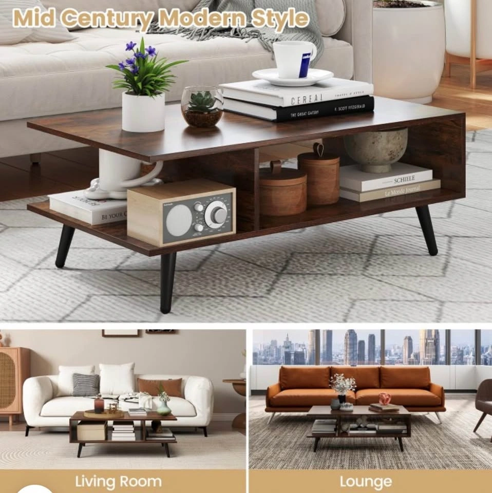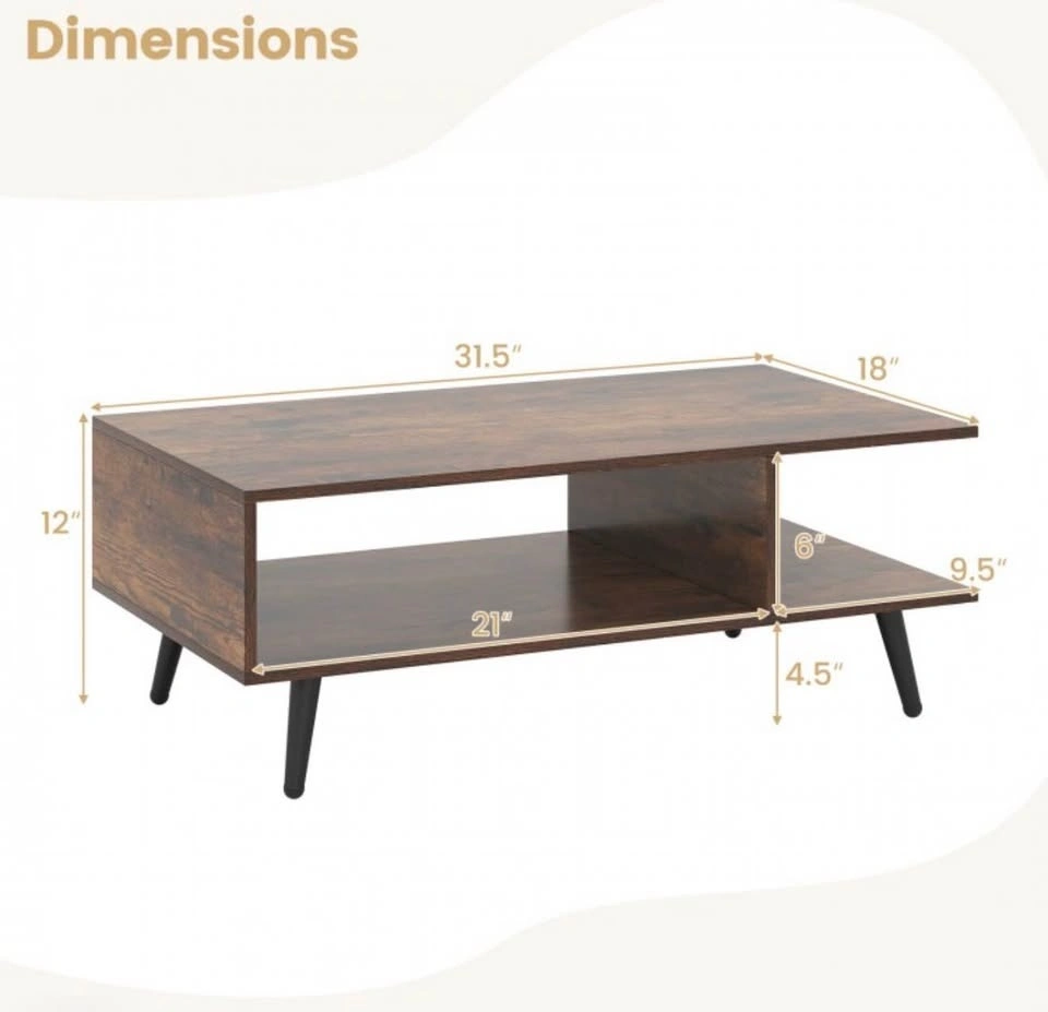 Add both style and function to your living space with this mid-century modern 2-tier coffee table from Costway. Its sleek rectangular design, complete with two open storage compartments and a spacious tabletop, helps keep your living room tidy while offering a perfect spot for drinks, books, décor, and media accessories. The sturdy metal legs give reliable support and the wood finish brings timeless charm that complements most décor styles. With ample clearance underneath, it’s easy to clean around and under the table. This versatile piece isn’t just for your living room—it can also serve as a lounge accent table, family room centerpiece, or casual workstation surface.