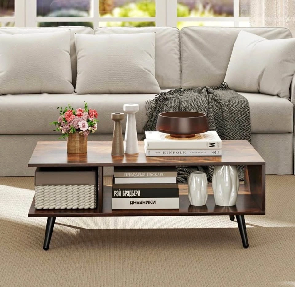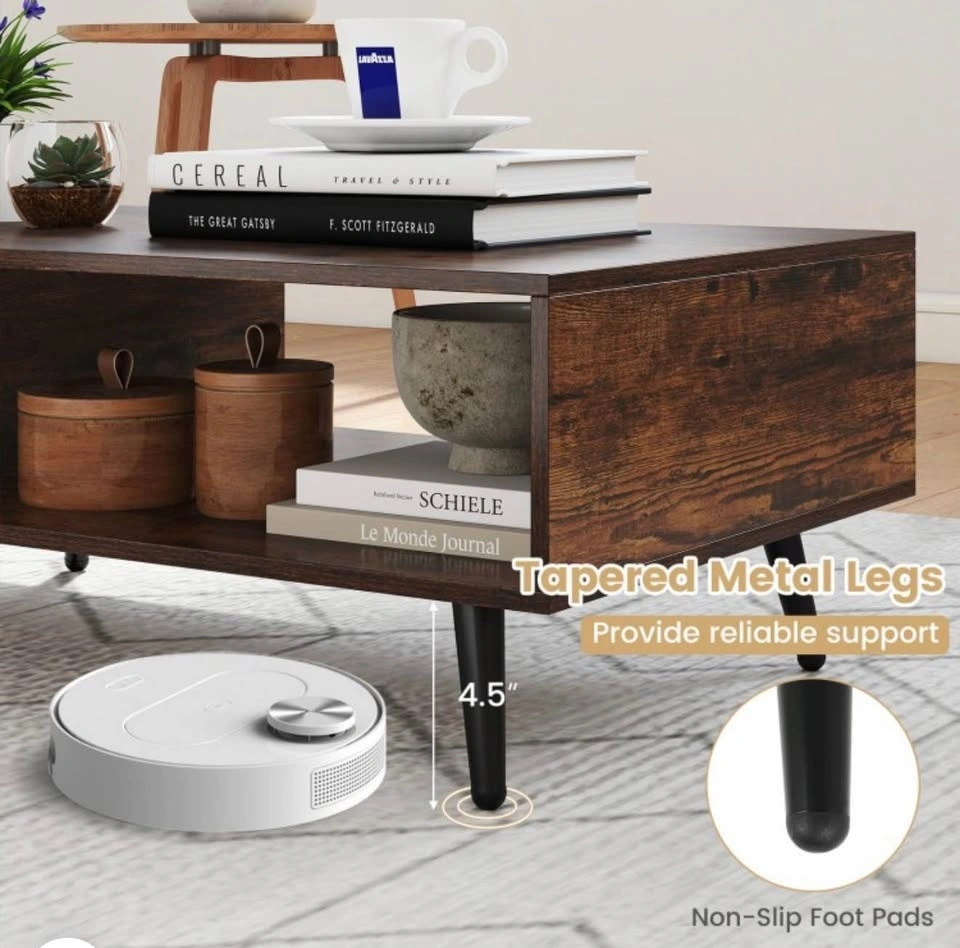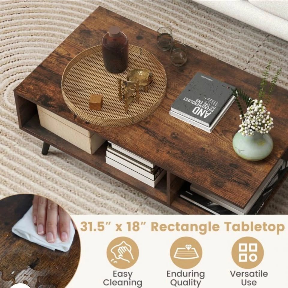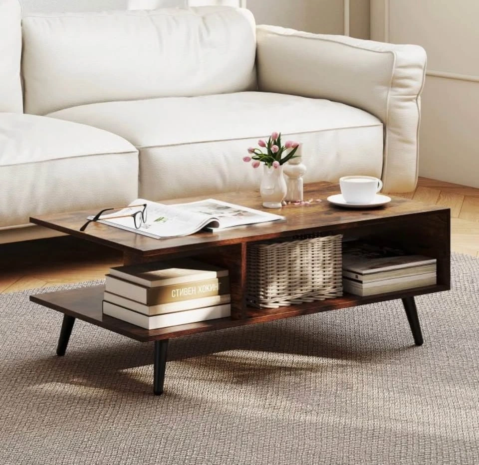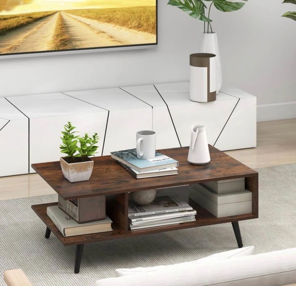 Add both style and function to your living space with this mid-century modern 2-tier coffee table from Costway. Its sleek rectangular design, complete with two open storage compartments and a spacious tabletop, helps keep your living room tidy while offering a perfect spot for drinks, books, décor, and media accessories. The sturdy metal legs give reliable support and the wood finish brings timeless charm that complements most décor styles. With ample clearance underneath, it’s easy to clean around and under the table. This versatile piece isn’t just for your living room—it can also serve as a lounge accent table, family room centerpiece, or casual workstation surface.
