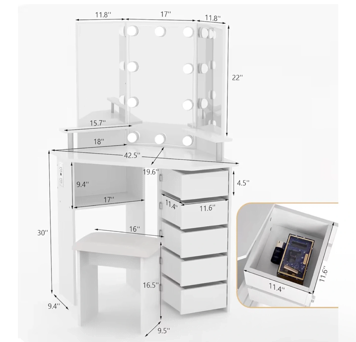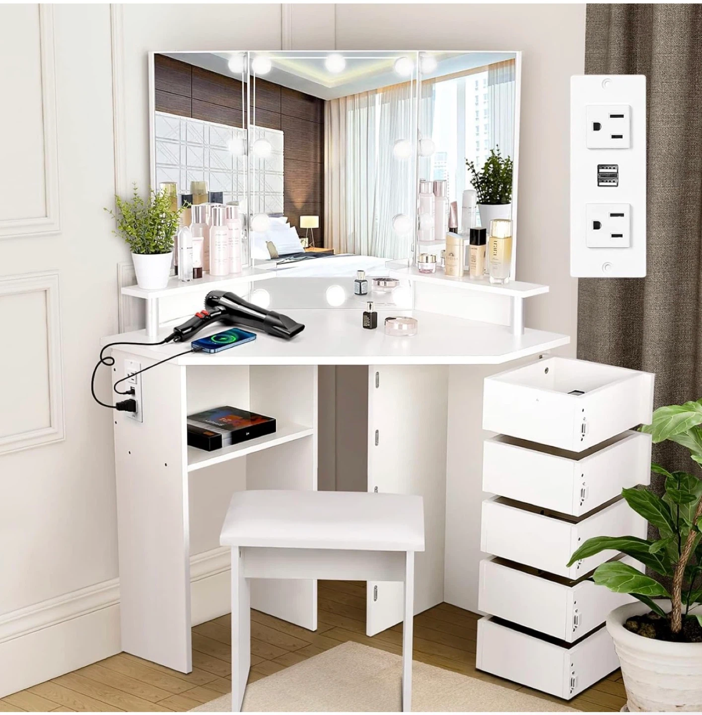 White Corner Vanity Makeup Table with Lighted Mirror