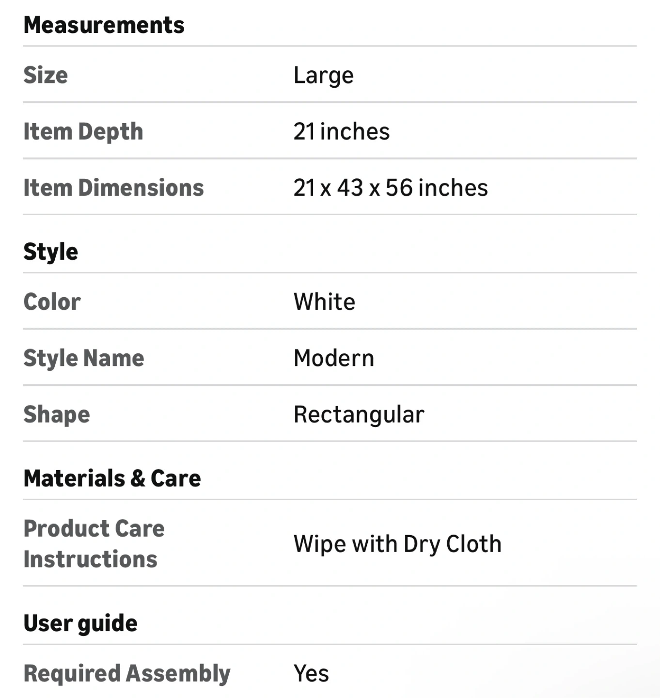 The dimensions are 21 x 43 x 56 inches. It's a modern style with a rectangular shape. Easy to care for, just wipe with a dry cloth