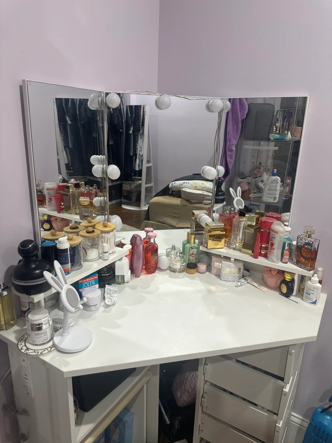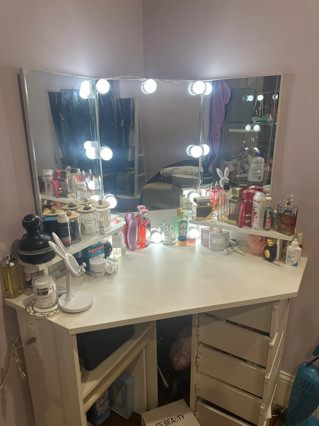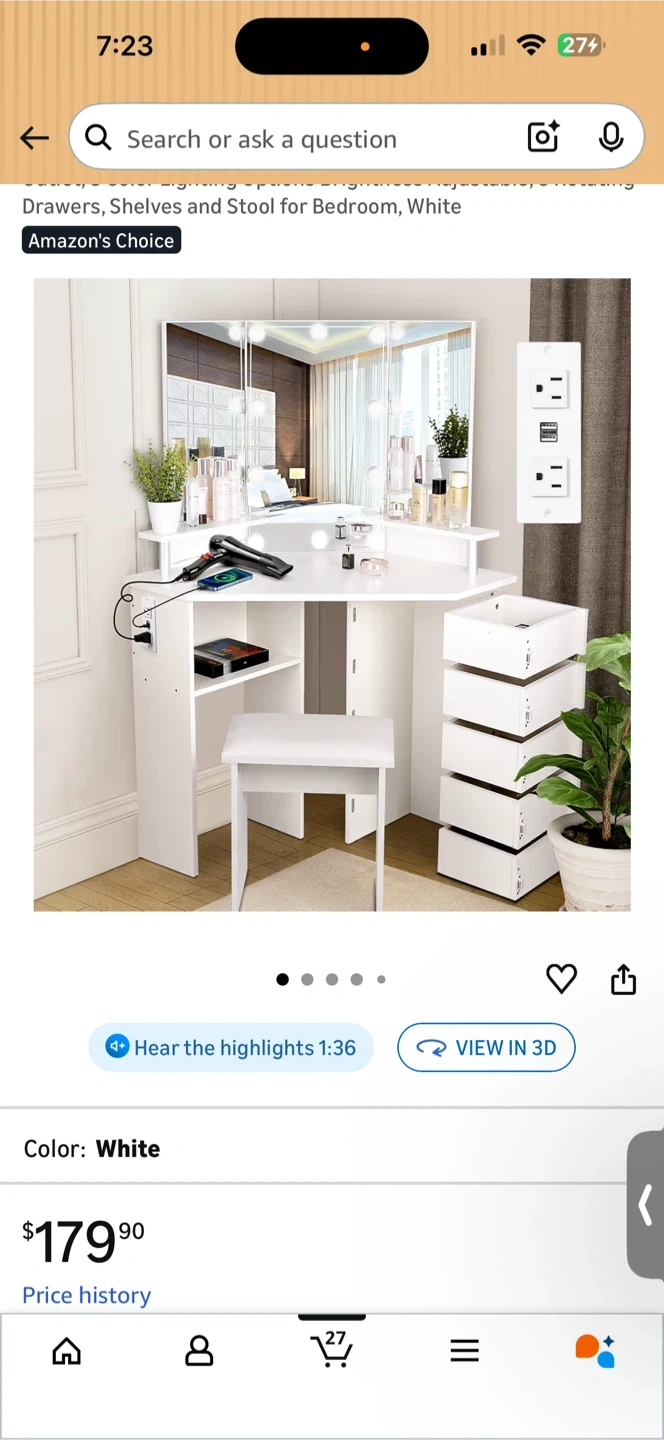Selling a white corner vanity makeup table! It features a lighted mirror and comes with a stool.