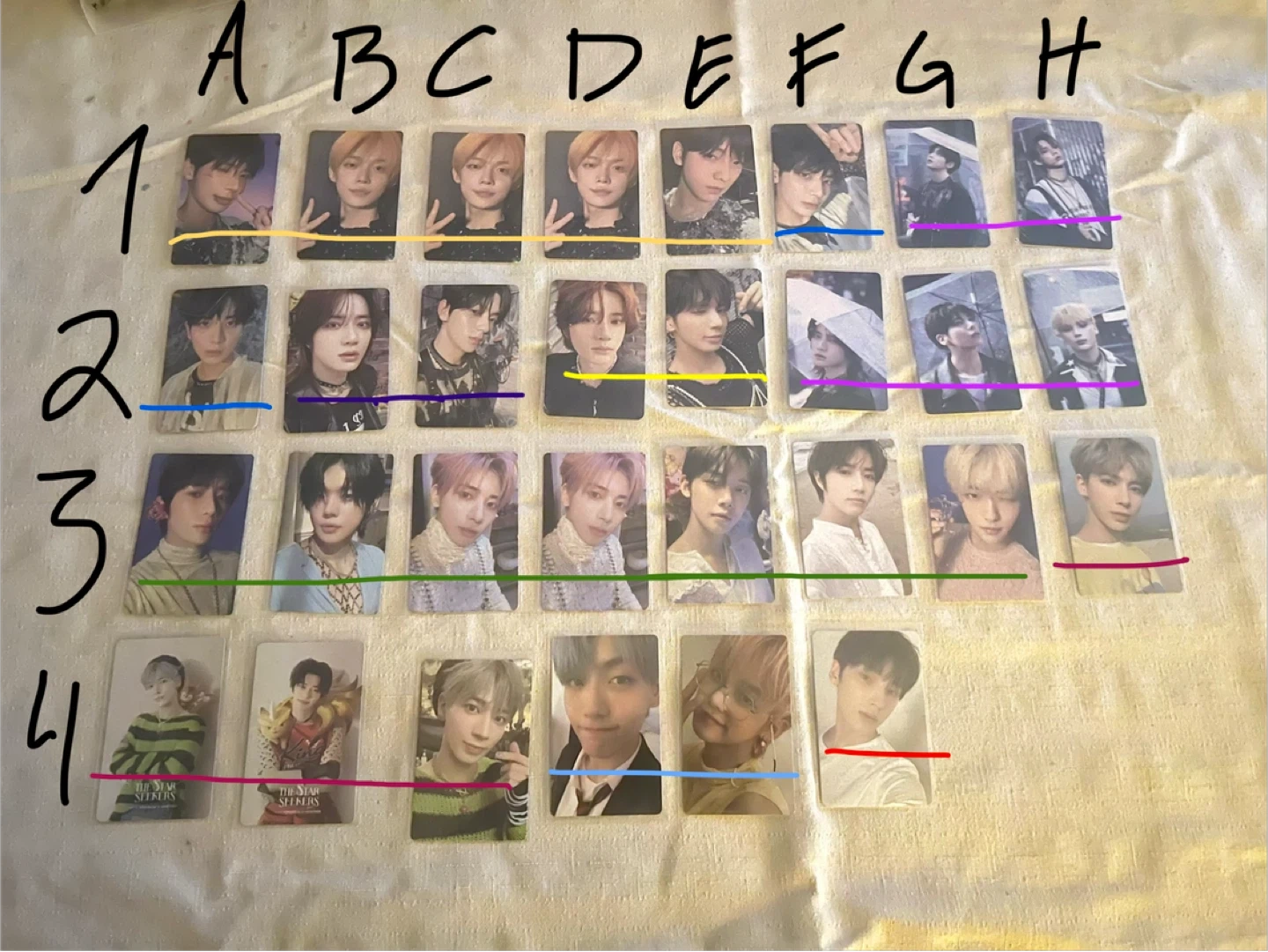 Choose a number and letter or a whole section. Per card is 1 dollars while the whole thing is of photocards is 10-15 (can be negotiated)
