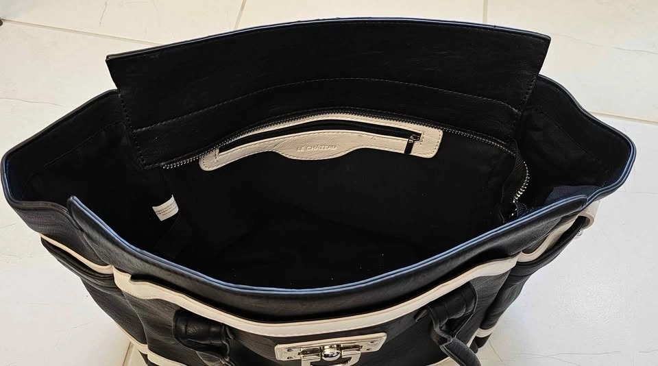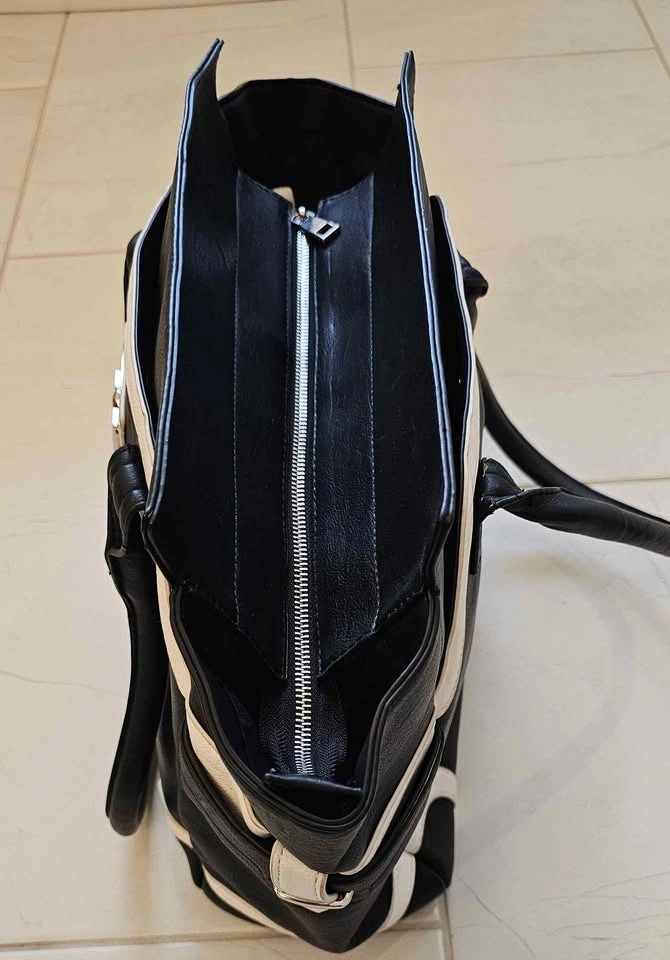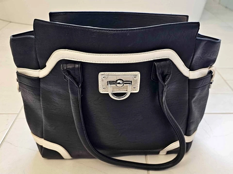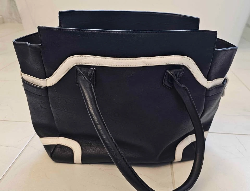 Like new pleather tote, black with white trim, barrel style. 16"x11"x8" fits laptop. Silvervalley Golden Ears area. I have several other bags for sale, check out my other listings!