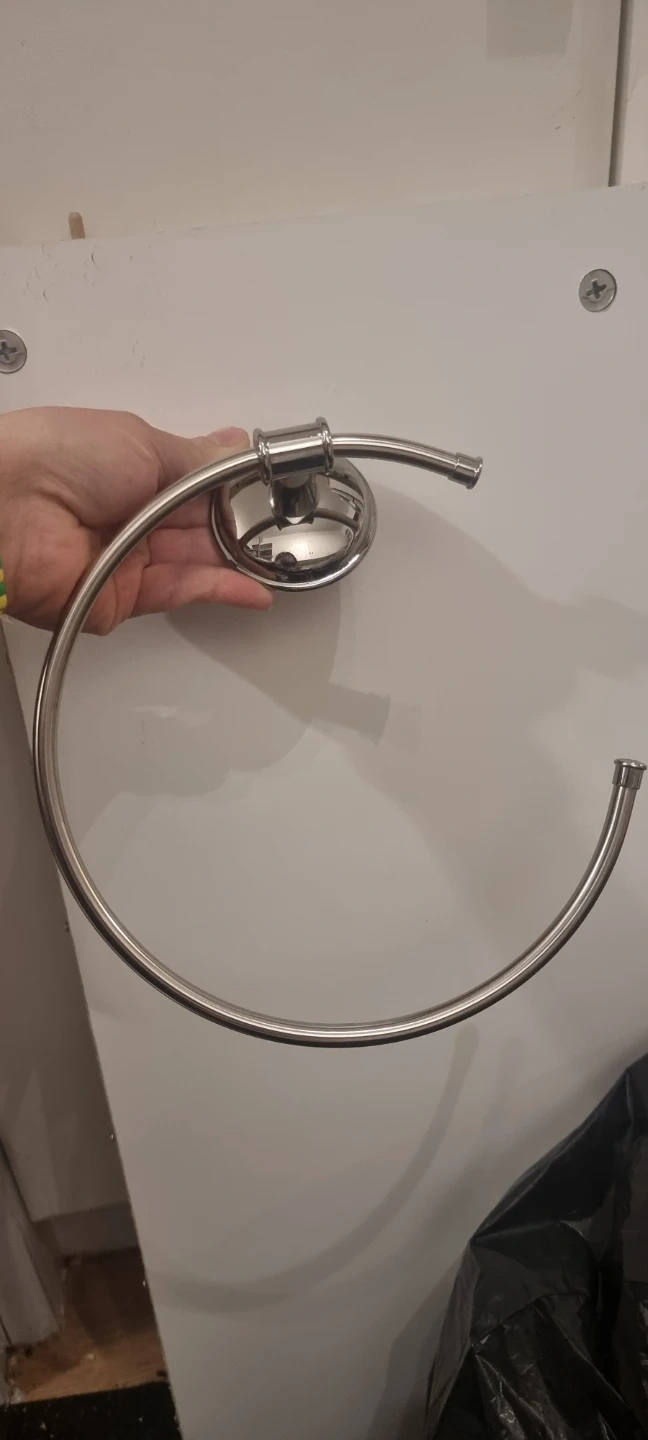 Here's a towel ring holder! It's in great condition and ready to be installed in your bathroom or kitchen. It has a nice silver finish that would match most decor styles