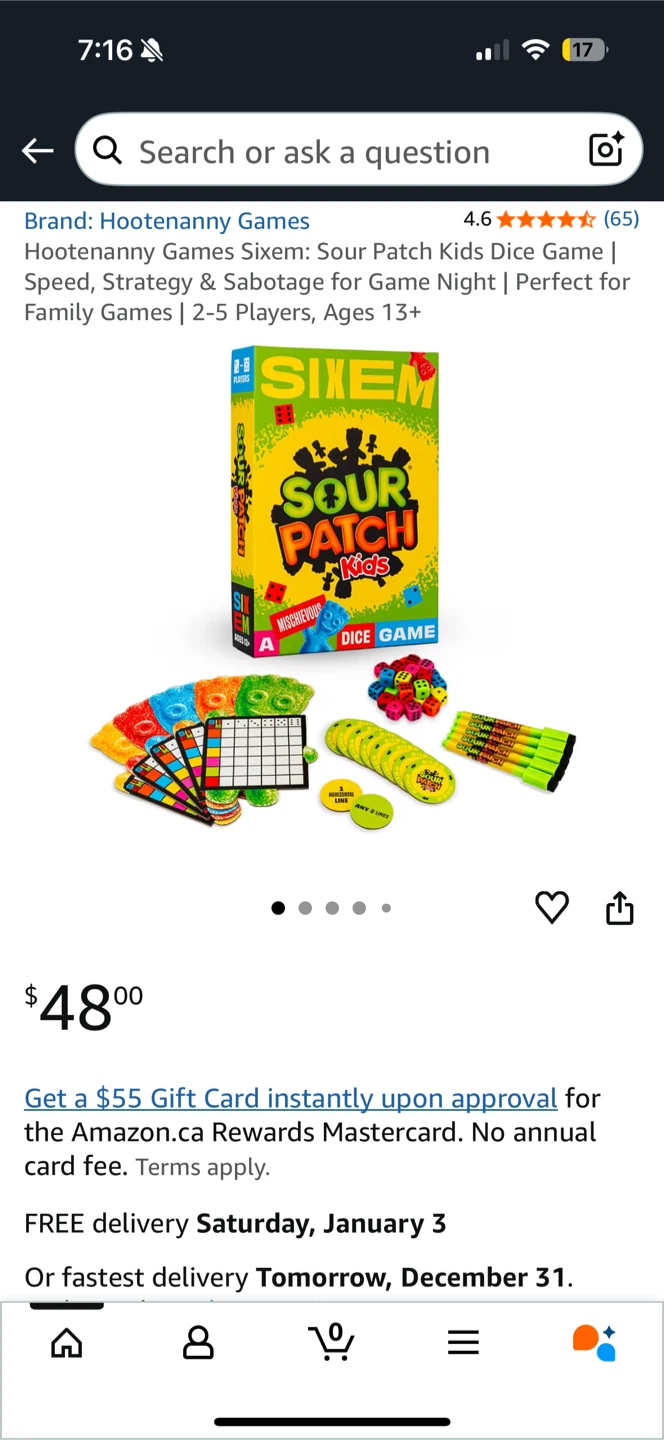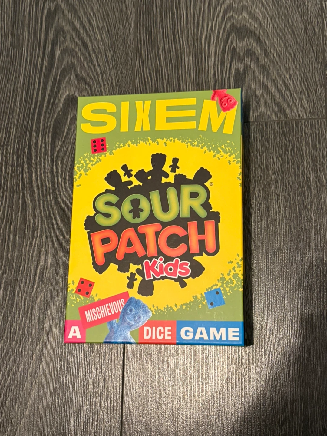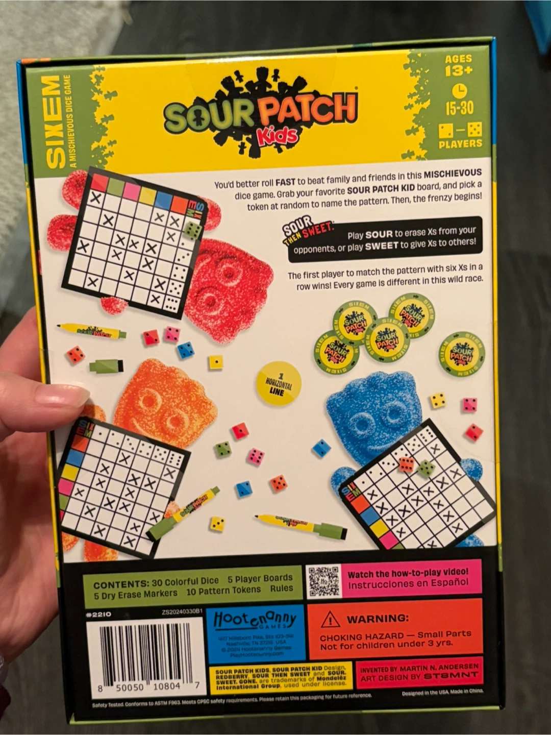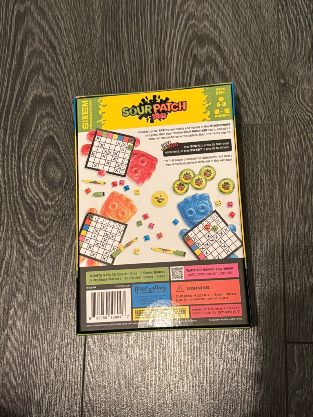 Selling a Hootenanny Games Sixem: Sour Patch Kids Dice Game! Perfect for family game nights. The game is designed for 2-5 players and is suitable for ages 13+. It includes 30 colorful dice, 5 player boards, 5 dry erase markers, and 10 pattern tokens. Get ready for some mischievous fun!