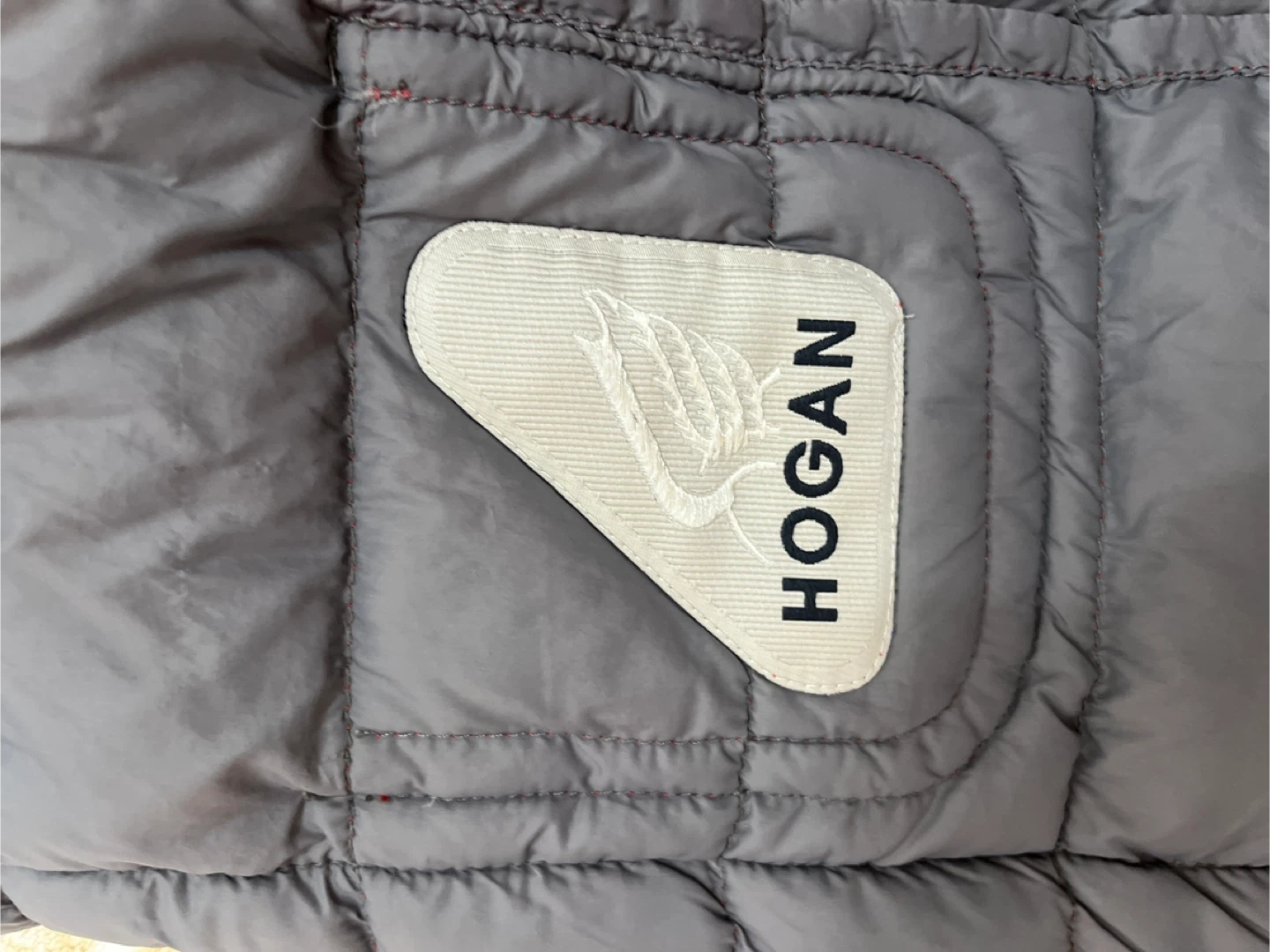 This is a stylish Hogan padded jacket in a vibrant red colour! It features a unique design with grey accents. It's perfect for adding a pop of colour to your wardrobe and staying warm at the same time.