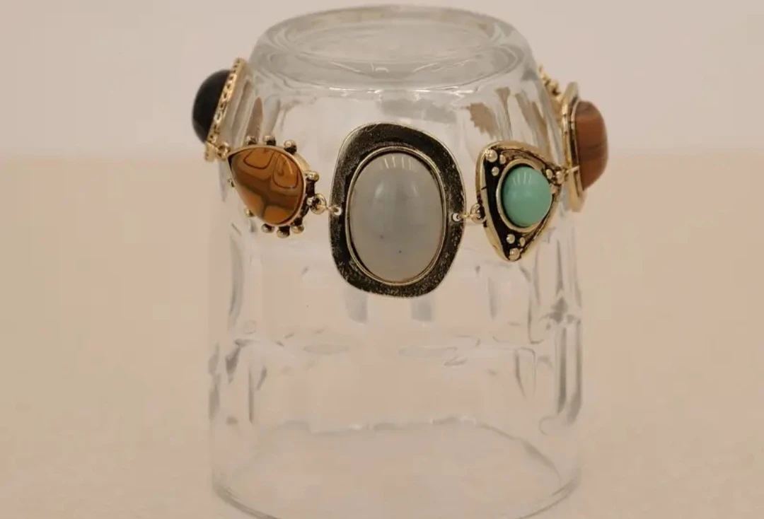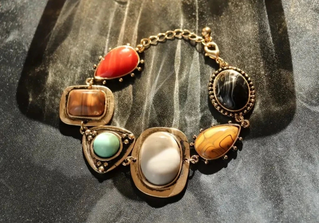Selling a cute boho-style bracelet! It features a variety of colourful stones set in a gold-tone metal. Perfect for adding a unique touch to any outfit!