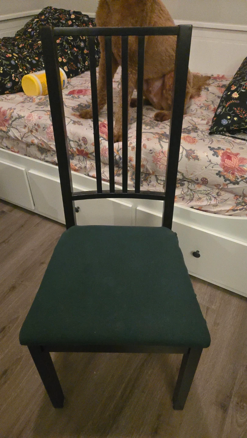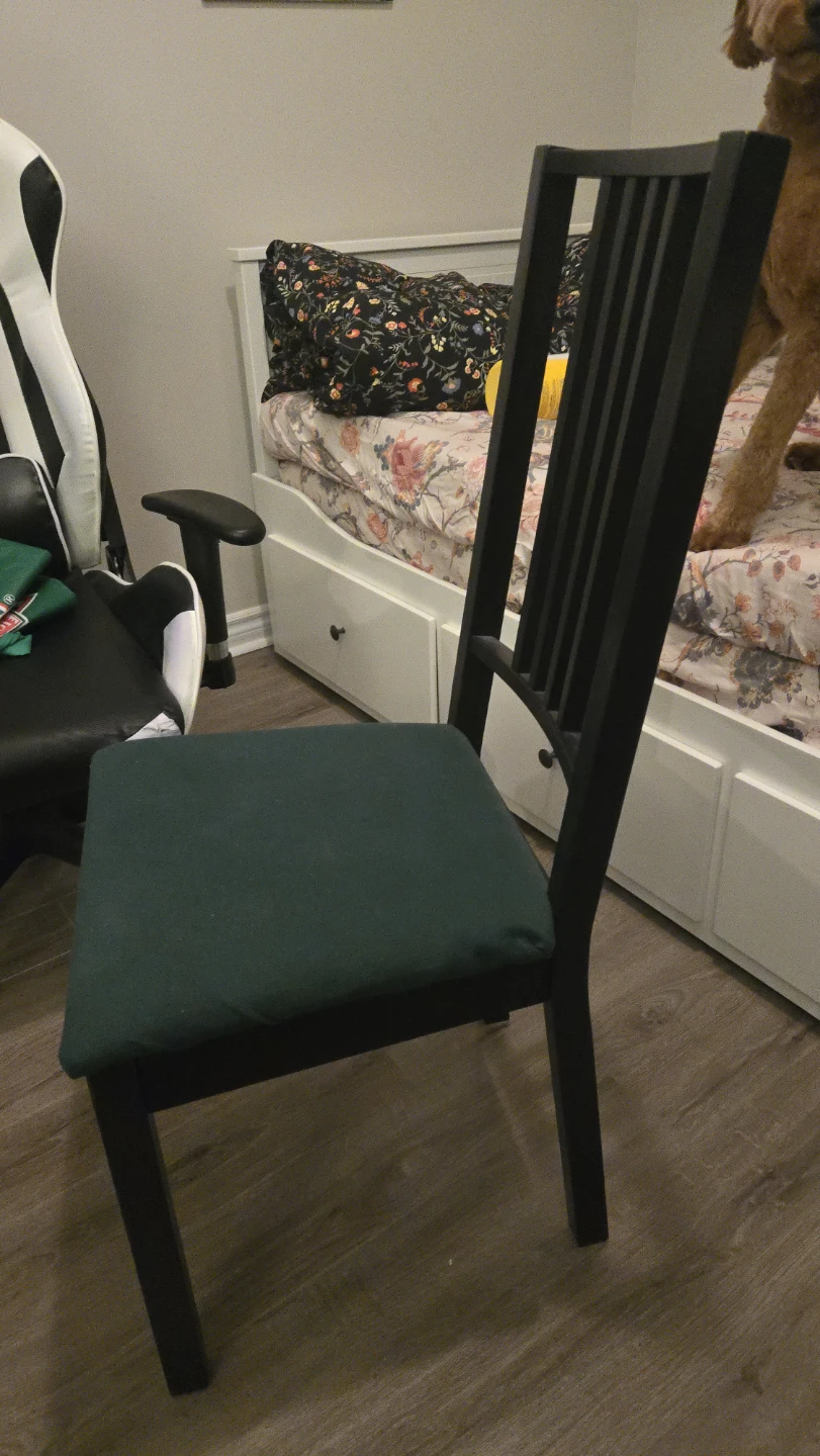 Selling a sturdy black IKEA dining chair! It has a comfortable green seat cushion. Perfect for adding extra seating to your dining area or kitchen.