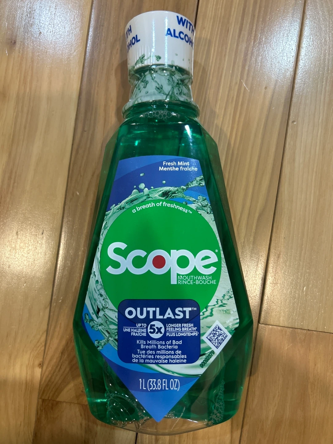 Selling a bottle of Scope Outlast mouthwash in Fresh Mint flavor. It's a 1L (33.8 FL OZ) bottle. This mouthwash kills millions of bad breath bacteria, giving you a longer-lasting fresh feeling