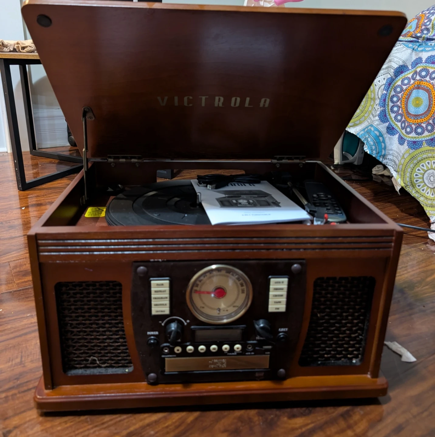 Selling a Victrola 8-in-1 Turntable in great condition! It's a VTA-600BPC model. The unit features a classic design with modern functionality. It includes the original manual and remote control. Manufactured in December 2020.
