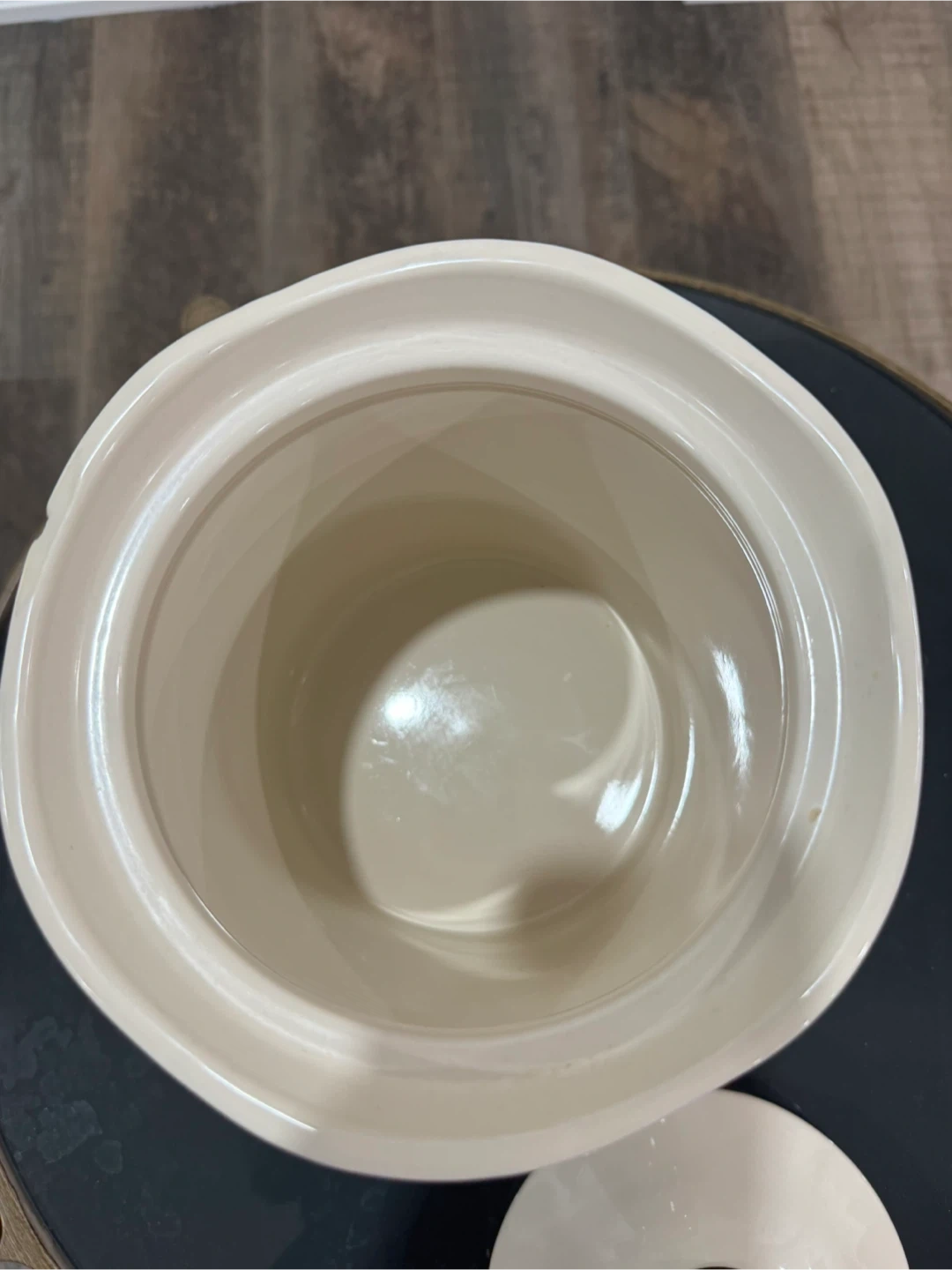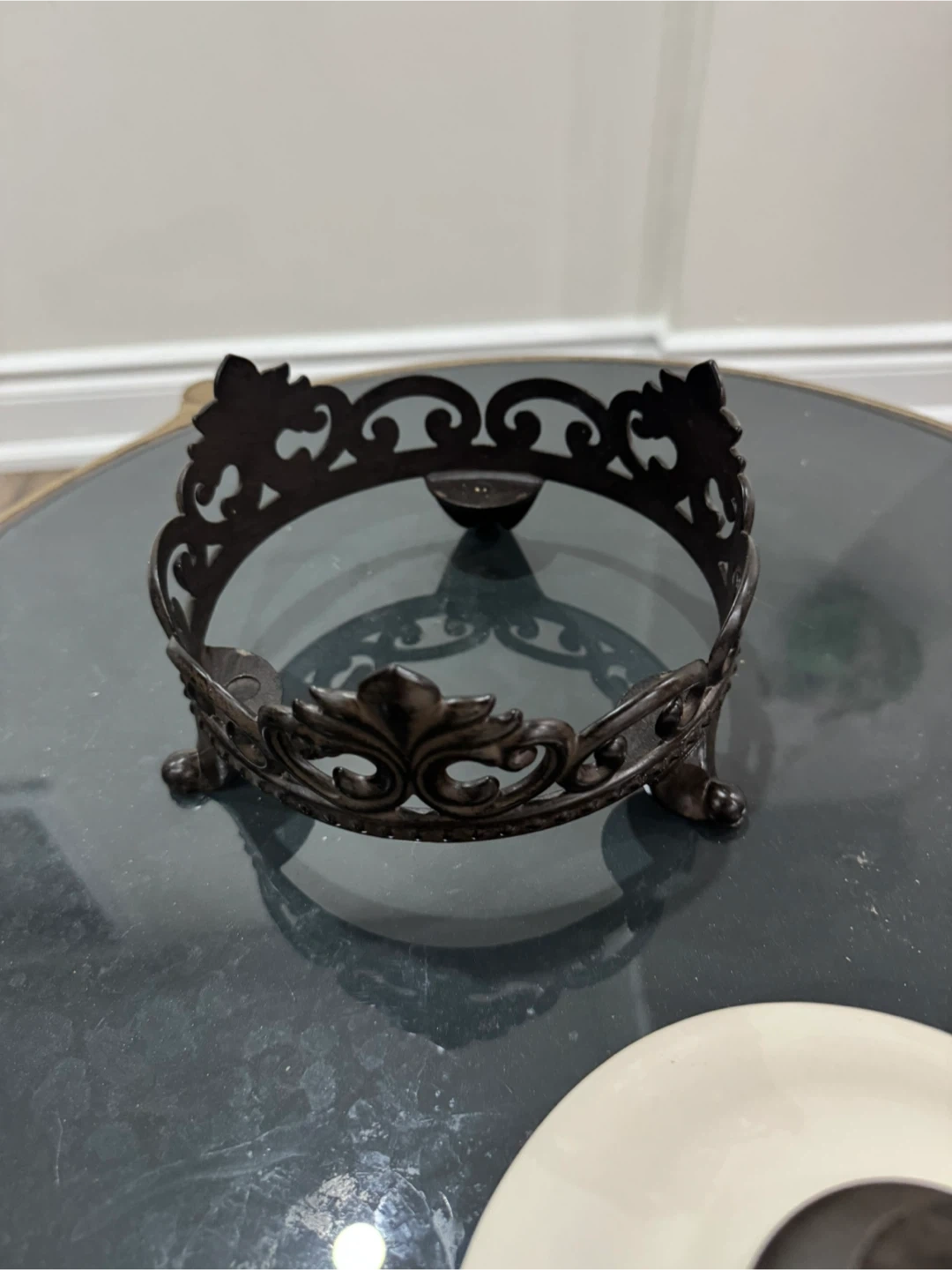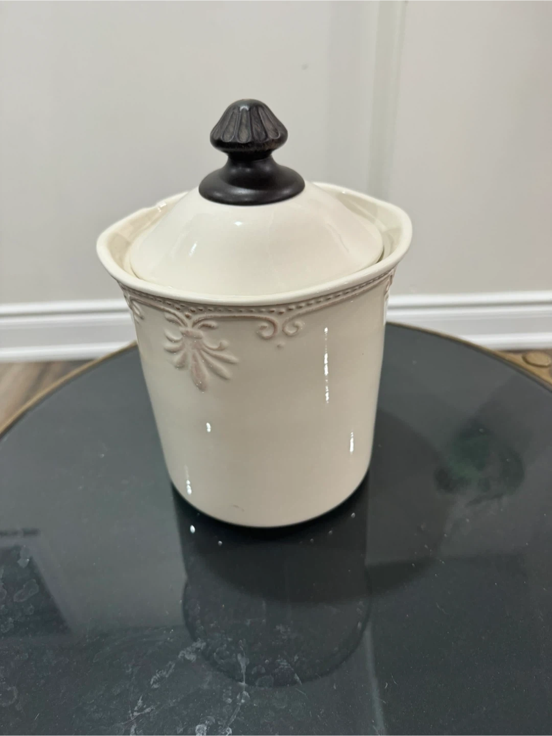 Selling a cream-coloured jar with a decorative metal stand. It's in great condition and would look lovely in any room