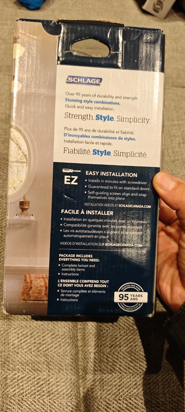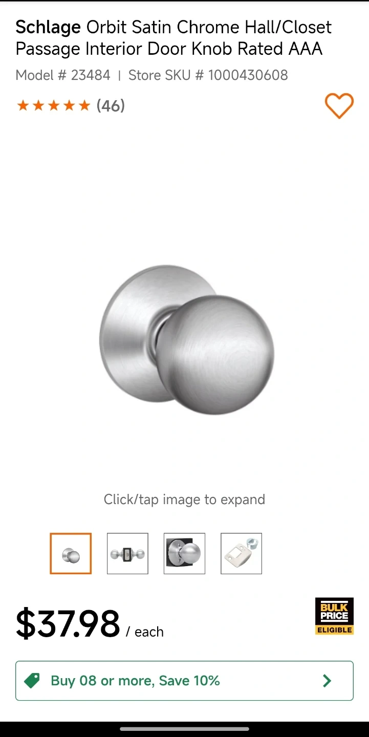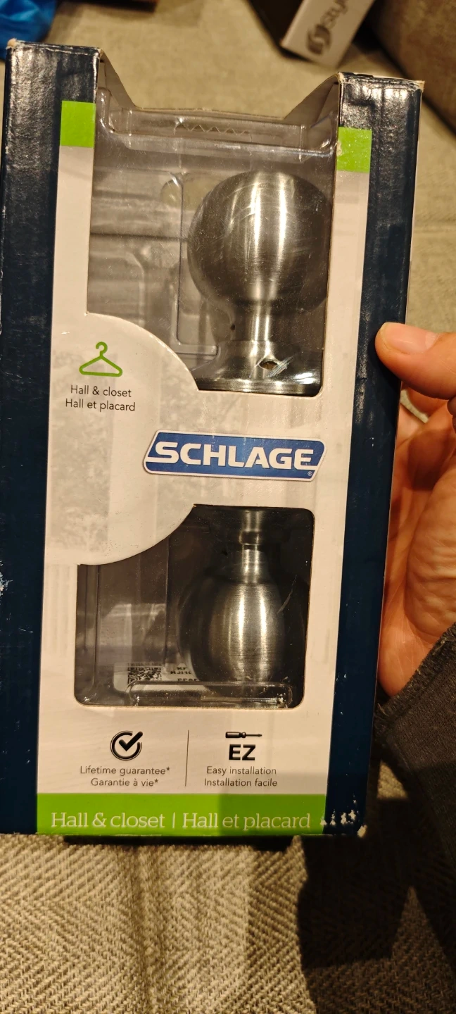 Selling a brand new Schlage Orbit Hall & Closet passage interior door knob. It's in satin chrome and still in the box. The box includes all the necessary parts and instructions for easy installation. This doorknob is rated AAA.