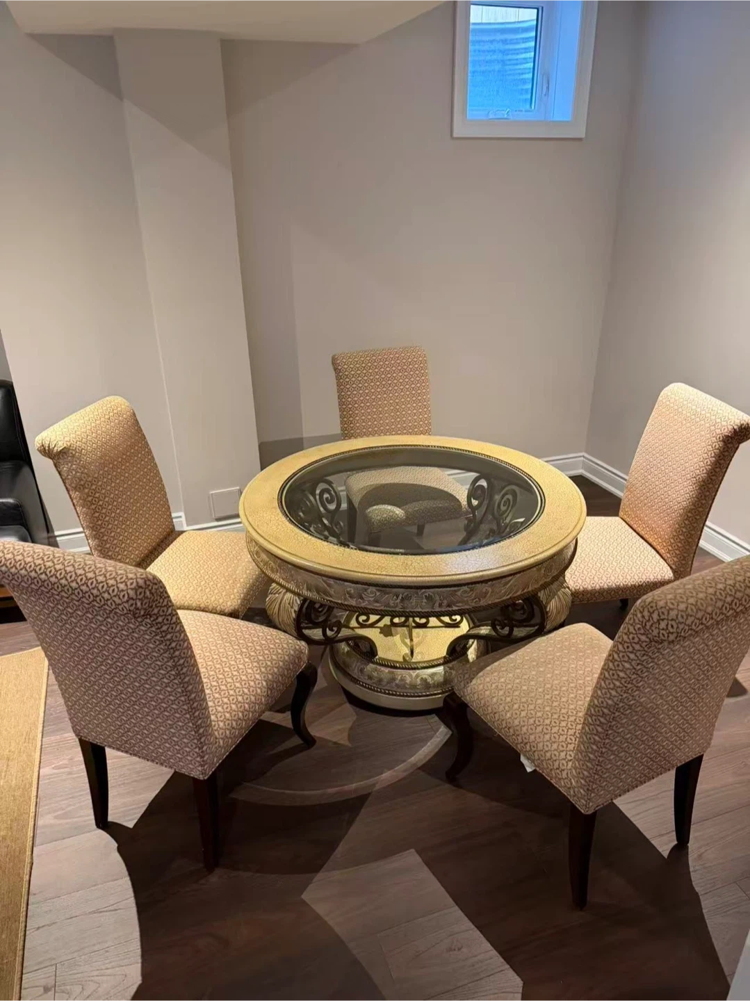 Selling a lovely round dining table with a 49”glass top, accompanied by six matching chairs. The set features a unique design with intricate detailing on the table base and patterned upholstery on the chairs. It's a great addition to any dining space!