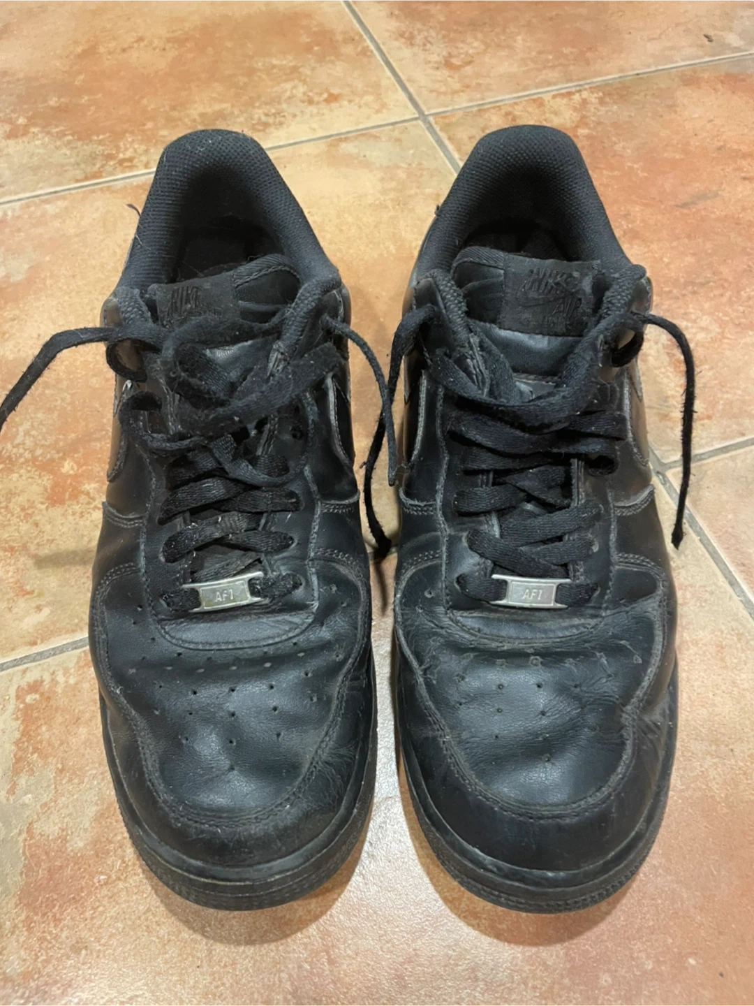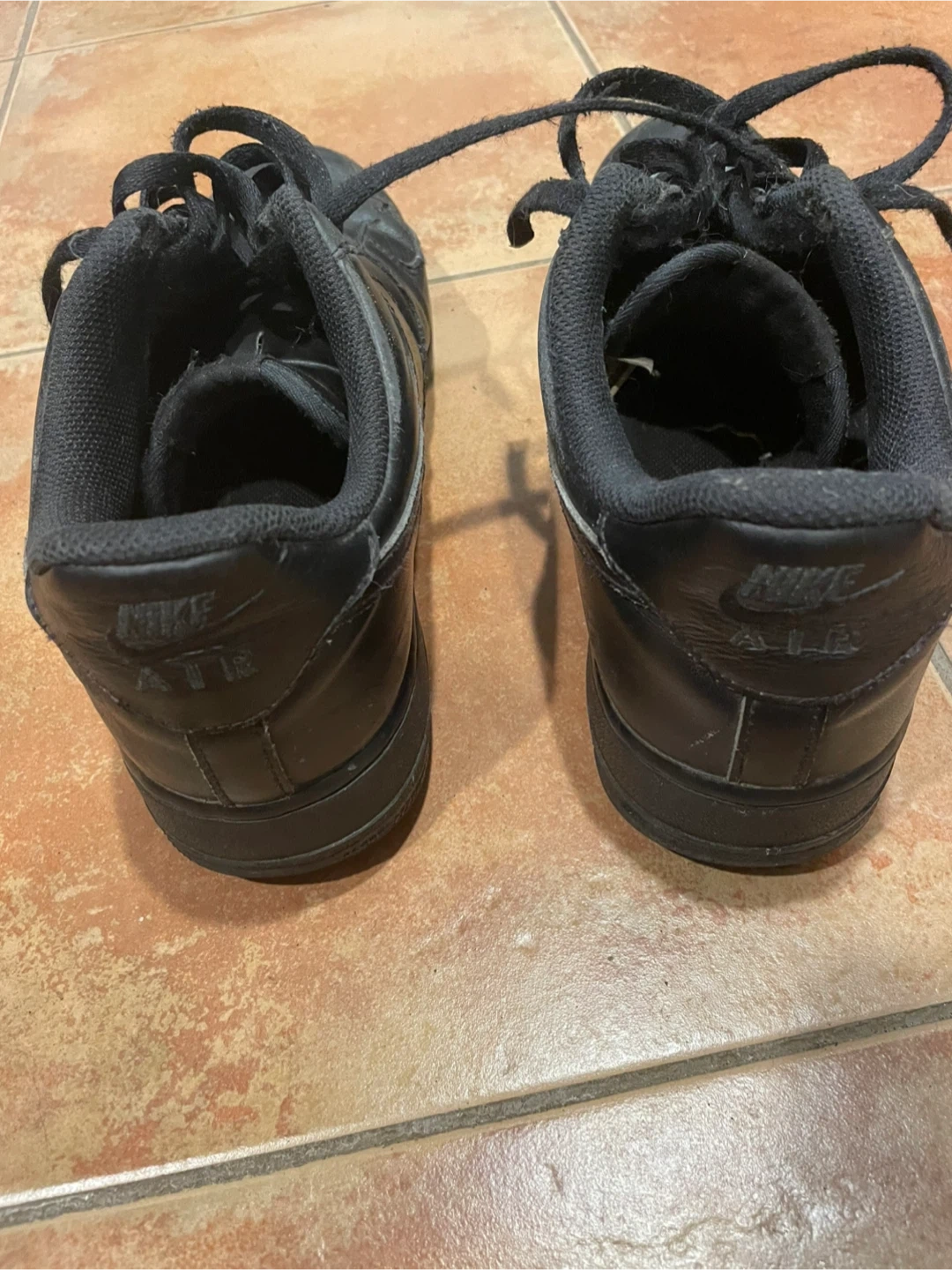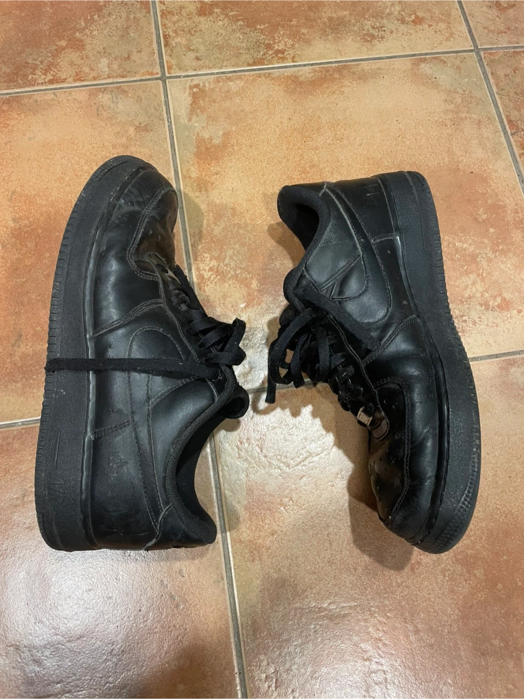 Selling a pair of black Nike Air Force 1 sneakers. They show some signs of wear, but they've still got lots of life left in them! Size men’s us 11.